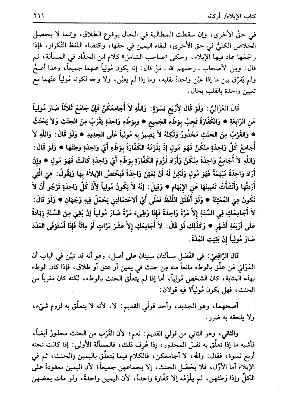 قَال الغَزَالِيُّ: وَلَوْ قَالَ لأَرْبَعِ نِسْوَةٍ: وَالله لاَ أُجَامِعُكُنَّ فَإِنْ جَامَعَ ثَلاَثًا صَارَ مُولِيًا عَنِ الرَّابِعَةِ* وَالكَفَّارَةُ تَجِبُ بِوَطْءِ الجَمِيعِ* وَبِوَطْءِ وَاحِدَةٍ يَقْرُبُ مِنَ الحِنْثِ وَلاَ يَحْنَثُ* وَالقُرْبُ مِنَ الحِنْثِ مَحْذُورٌ وَلَكِنَّهُ لاَ يَصِيرُ بِهِ مُوليًا عَلَى الجَدِيدِ* وَلَوْ قَالَ: وَاللهِ لاَ أُجَامِعُ كُلَّ وَاحِدَةٍ مِنْكُنَّ فَهُوَ مُولٍ إِذْ يَلْزَمُهُ الكَفَّارَةُ بِوَطْءٍ أَيِّ وَاحِدَةٍ وَطِئَهَا* وَلَوْ قَالَ: وَاللهِ لاَ أُجَامِعُ وَاحِدَةً مِنْكُنَّ وَأَرَادَ لُزُومَ الكَفَّارَةِ بِوَطْءِ أَيِّ وَاحِدَةٍ كَانَتْ فَهُوَ مُولٍ* وَإِنْ أَرَادَ وَاحِدَةً مُبْهَمَةً فَهُوَ مُولٍ وَلَكِنْ لَهُ أَن يُعَيِّنَ وَاحِدَةً فيَخْتَصُّ الإِيلاَءُ بِهَا وَيَقُولُ: هِيَ الَّتي أَرَدتُّهَا وَأَنْشَأْتُ تَعْيِينَهَا عَنِ الإبْهَام* وَقِيلَ: إنَّهُ لاَ يَكُونُ مُوليًا لأَنَّ كُلَّ وَاحِدَةٍ تَرْجُو أنْ لاَ تَكونَ هِيَ المعَيَّنَةَ* وَلَوْ أَطلَقَ اللَّفْظَ فَعَلَى أَيِّ الاحْتمَالَيْنِ يُحْمَلُ فِيهِ وَجْهَانِ* وَلَوْ قَالَ: لاَ أُجَامِعُكِ في السَّنَةِ إِلاَّ مَرَّةً وَاحِدَةً فَإذَا وَطِئَ مَرَّةً صَارَ مُوليًا إنْ بَقِيَ مِنَ السَّنَةِ زِيَادَةٌ عَلَى أَرْبَعَةِ أَشْهُرٍ* وَكَذَلِكَ لَوْ قَالَ: لاَ أُجَامِعُكِ إِلاَّ عَشْرَ مَرَّاتٍ أَوْ مِائَةً فَإذَا اسْتَوْفَى العَدَدَ صَارَ مُوليًا إنْ بَقِيَتِ المُدَّةُ.