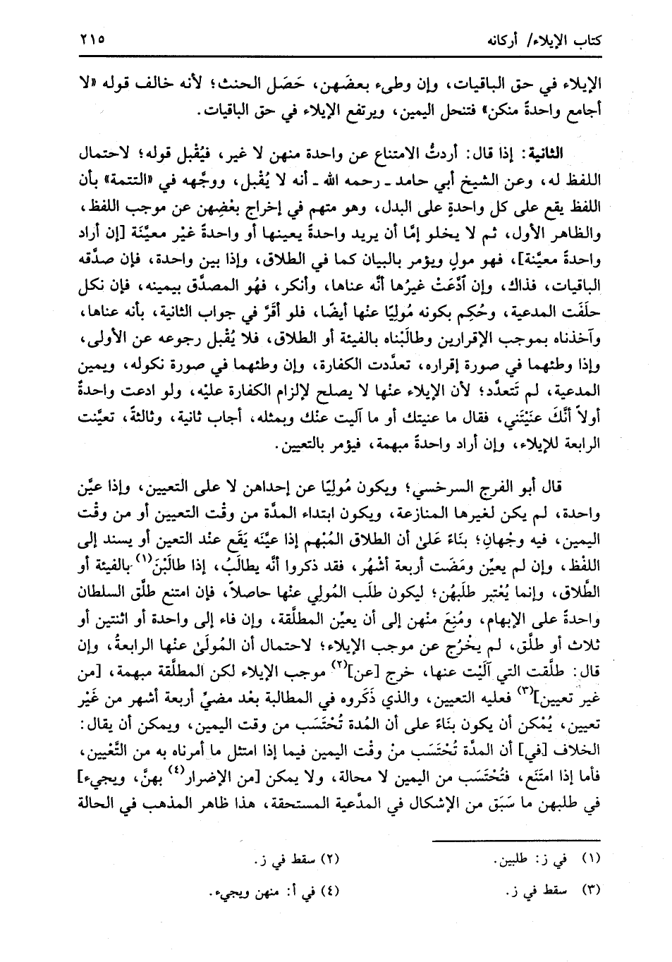 قال أبو الفرج السرخسي؛ ويكون مُولِياً عن إحداهن لا على التعيين، وإذا عيَّن واحدة، لم يكن لغيرها المنازعة، ويكون ابتداء المدَّة من وقْت التعيين أو من وقْت اليمين، فيه وجْهانِ؛ بنَاءً عَلى أن الطلاق المُبْهم إذا عيَّنَه يَقَع عنْد التعين أو يسند إلى اللفْظ، وإن لم يعيِّن ومَضَت أربعة أشْهُر، فقد ذكروا أنَّه يطالَبُ، إذا طالَبْنَ (¬1) بالفيئة أو الطَّلاق، وإنما يُعْتير طلَبهُن؛ ليكون طلَب المُولِي عنْها حاصلاً، فإن امتنع طلَّق السلطان واحدةٌ على الإبهام، ومُنِعَ منْهن إلى أن يعيِّن المطلَّقة، وإن فاء إلى واحدة أو اثنتين أو ثلاث أو طلَّق، لم يخْرُج عن موجب الإيلاء؛ لاحتمال أن المُولَى عنْها الرابعةُ، وإن قال: طلَّقت التي آلَيْت عنها، خرج [عن] (¬2) موجب الإيلاء لكن المطلَّقة مبهمة، [من غير تعيين] (¬3) فعليه التعيين، والذي ذَكَروه في المطالبة بعْد مضيِّ أربعة أشهر من غَيْر تعيين، يُمْكن أن يكون بنَاءً على أن المُدة تُحْتَسَب من وقت اليمين، ويمكن أن يقال: الخلاف [في] أن المدَّة تُحْتَسَب منْ وقْت اليمين فيما إذا امتثل ما أمرناه به من التَّعْيين، فأما إذا امتَنَع، فتُحْتَسَب من اليمين لا محالة، ولا يمكن [من الإضرار (¬4) بهنَّ، ويجيء] في طلبهن ما سَبَق من الإشكال في المدَّعية المستحقة، هذا ظاهر المذهب في الحالة