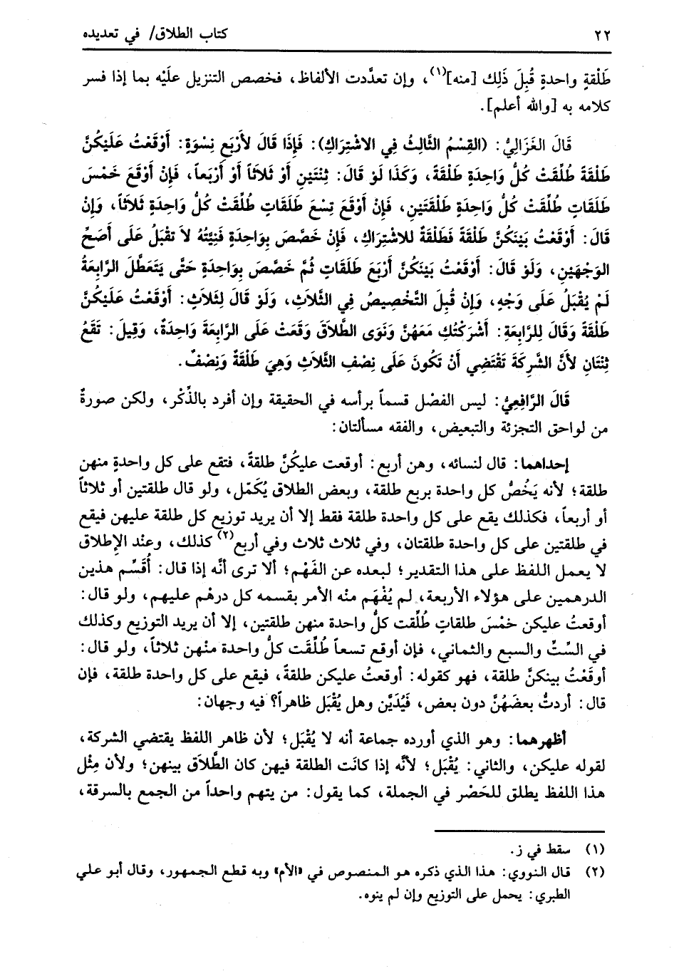 قَالَ الغَزَالِيُّ: (القِسْمُ الثَّالِثُ فِي الاشْتِرَاكِ): فَإِذَا قَالَ لأَرْبَع نِسْوَةٍ: أَوْقَعْتُ عَلَيْكُنَّ طَلْقَةً طُلِّقَتْ كُلُّ وَاحِدَةٍ طَلْقَةً، وَكَذَا لَوْ قَالَ: ثِنْتَيْنِ أَوْ ثَلاَثاً أَوْ أَرْبَعاً، فَإِنْ أَوْقَعَ خَمْسَ طَلَقَاتٍ طُلِّقَتْ كُلُّ وَاحِدَةٍ طَلْقَتَيْنِ، فَإِنْ أَوْقَعَ تِسْعَ طَلَقَاتٍ طُلِّقَتْ كُلُّ وَاحِدَةٍ ثَلاَثاً، وَإِنْ قَالَ: أَوْقَعْتُ بَيْنَكُنَّ طَلْقَةً فَطَلْقَةٌ للاشْتِرَاكِ، فَإِنْ خَصَّصَ بِوَاحِدَةٍ فَنِيَّتُهُ لاَ تقْبَلُ عَلَى أَصَحِّ الوَجْهَيْنِ، وَلَوْ قَالَ: أَوْقَعْتُ بَيْنَكُنَّ أَرْبَعَ طَلَقَاتٍ ثُمَّ خَصَّصَ بِوَاحِدَةٍ حَتَّى يَتَعَطَّلَ الرَّابِعَةُ لَمْ يُقْبَلُ عَلَى وَجْهٍ، وإنْ قُبِلَ التَّخْصِيصُ فِي الثَّلاَثِ، وَلَوْ قَالَ لِثَلاَثٍ: أَوْقَعْتُ عَلَيْكُنَّ طَلْقَةً وَقَالَ لِلرَّابِعَةِ: أَشْرَكْتُكِ مَعَهُنَّ وَنَوَى الطَّلاَقَ وَقَعَتْ عَلَى الرَّابِعَةَ وَاحِدَةٌ، وَقِيلَ: تَقَعُ ثِنْتَانِ لأَنَّ الشَّرِكَةَ تَقْتَضِي أَنْ تَكُونَ عَلَى نِصْفِ الثَّلاَثِ وَهِيَ طَلْقَةٌ وَنِصْفٌ.