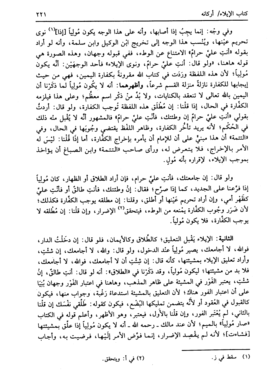 الثانية: الإيلاء يَقْبل التعليق؛ كالطَّلاق وكالأيمان، فلو قال: إن دخَلْتُ الدار، فوالله، لا أجامعك، يصير مُولِيًا عند الدخول، ولو قال: والله، لا أجامعك، إن شئْتِ، وأراد تعليق الإيلاء بمشيئتها، كأنه قال: إن شِئْتِ أن لا أجامعك، فوالله، لا أجامعك، فلا بد من مشيئتها؛ ليكون مُوليًا، وقد ذكَرْنا في "الطلاق": أنه لو قال: أنتِ طالقٌ، إنْ شئْتِ، يعتبر الفور في المشيئة على ظاهر المذهب، وهاهنا في اعتبار الفَوْر وجهان بُنِيَا على أن اعتبار الفور هناك؛ لأن التعليق بالمشيئة استدعاءُ رَغْبة، وجواب منها، فيكون كالقبول في العُقود أو لأنَّه يتضمن تمليكها البُضْع، فيكون كقوله: طَلِّقي نفْسَك إن قلْنا بالثاني، لم يُعْتَبر الفور، وإن قلْنا بالأَول، فيعتبر، وهو الأظهر، وأعلم قوله في الكتاب "صار مُولِيًا" بالميم؛ لأن عند مالك -رحمه الله- أنه لا يكون مُولِياً إذا علَّق بمشيئتها [فشاءت]؛ لأنه لم يقْصِد الإضرار، إنما فوَّض الأمر إلَيْها، فرضيت به، وأجاب
