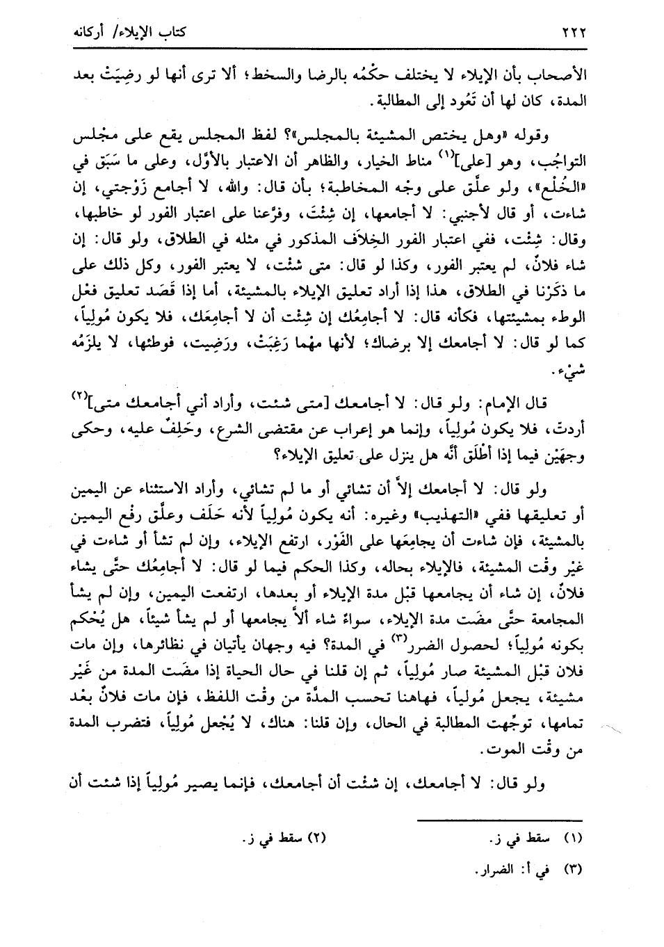 ولو قال: لا أجامعك إلاَّ أن تشائي أو ما لم تشائي، وأراد الاستثناء عن اليمين أو تعليقها ففي "التهذيب" وغيره: أنه يكون مُولِياً لأنه حَلَف وعلَّق رفْع اليمين بالمشيئة، فان شاءت أن يجامِعَها على الفَوْر، ارتفع الإيلاء، وإن لم تشأ أو شاءت في غيْر وقْت المشيئة، فالإيلاء بحاله، وكذا الحكم فيما لو قال: لا أجامِعُك حتَّى يشاء فلانٌ، إن شاء أن يجامعها قبْل مدة الإيلاء أو بعدها، ارتفعت اليمين، وإن لم يشأ المجامعة حتَّى مضَت مدة الإيلاء، سواءٌ شاء إلاَّ يجامعها أو لم يشأ شيئاً، هل يُحْكم بكونه مُولِياً؛ لحصول الضرر (¬3) في المدة؟ فيه وجهان يأتيان في نظائرها، وإن مات فلان قبْل المشيئة صار مُولِياً، ثم إن قلنا في حال الحياة إذا مضَت المدة من غَيْر مشيئة، يجعل مُولياً، فهاهنا تحسب المدَّة من وقْت اللفظ، فإن مات فلانٌ بعْد تمامها، توجَّهت المطالبة في الحال، وإن قلنا: هناك، لا يُجْعل مُولِياً، فتضرب المدة من وقْت الموت.