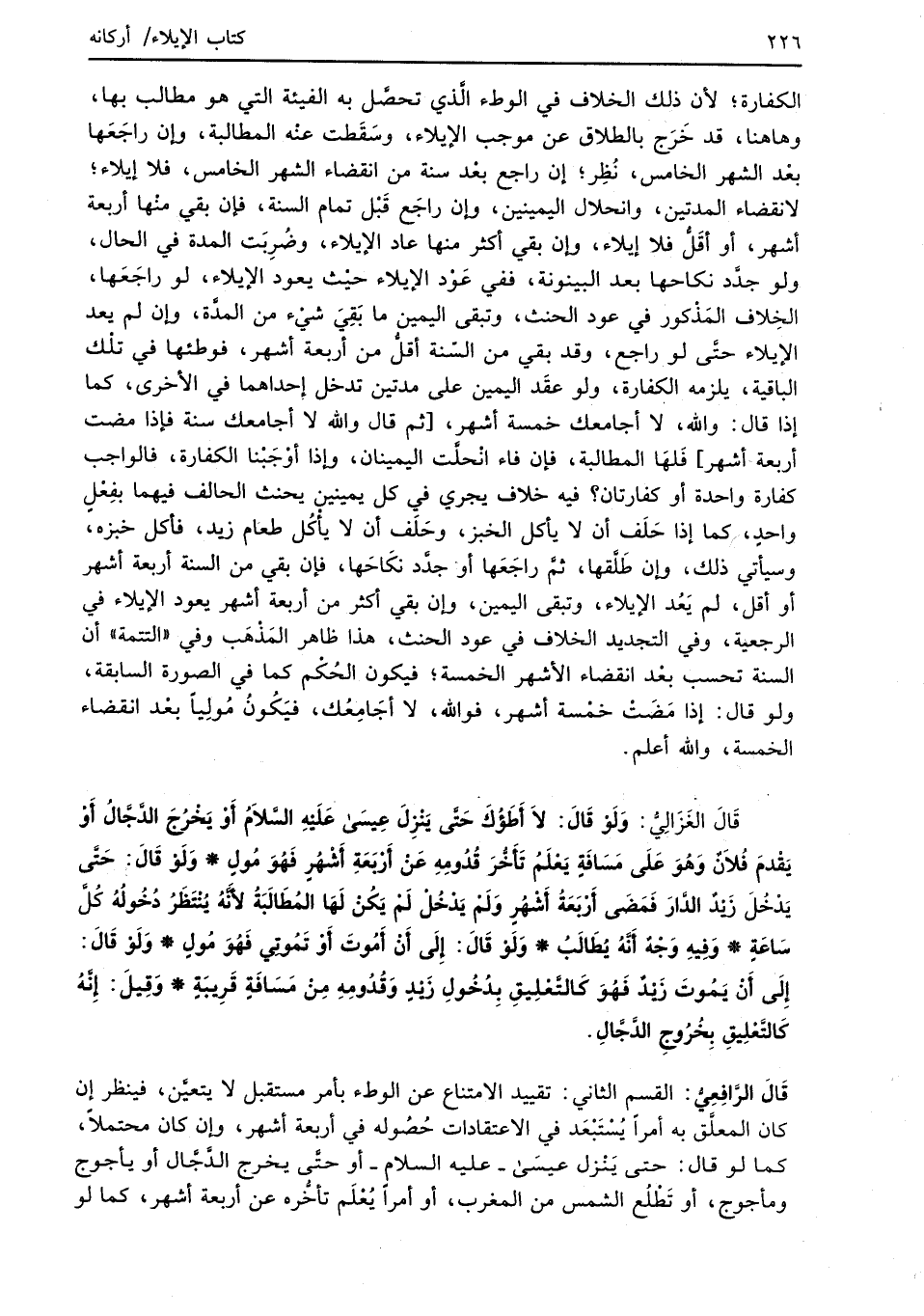 قَالَ الرَّافِعِيُّ: القسم الثاني: تقييد الامتناع عن الوطء بأمر مستقبل لا يتعيَّن، فينظر إن كان المعلَّق به أمراً يُسْتَبْعَد في الاعتقادات حُصُوله في أربعة أشهر، وإن كان محتملاً، كما لو قال: حتى يَنْزل عيسَى -عليه السلام- أو حتَّى يخرج الدَّجَّال أو يأجوج ومأجوج، أو تَطلُع الشمس من المغرب، أو أمرًا يُعْلَم تأخُّره عن أربعة أشهر، كما لو