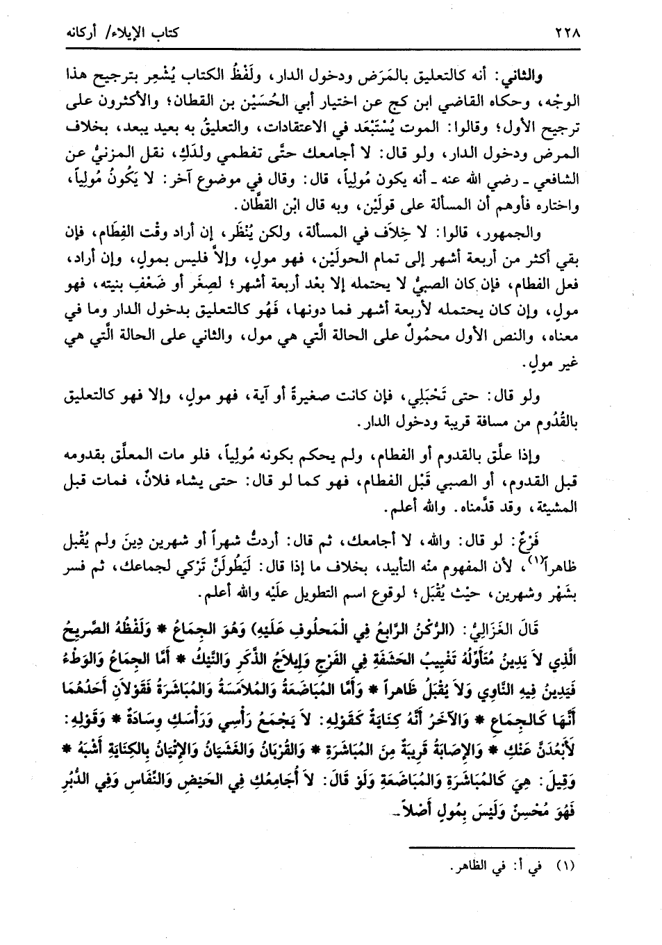 قَالَ الغَزَالِيُّ: (الرُّكْنُ الرَّابعُ في الْمَحلُوف عَلَيْهِ) وَهوَ الجِمَاعُ* وَلَفْظُهُ الصَّريِحُ الَّذِي لاَ يَدِينُ مُتَأوِّلُهُ تَغْيِيبُ الحَشَفَةِ فِي الفَرْجِ وَإيلاَجُ الذَّكَرِ وَالنَّيْكُ* أَمَّا الجِمَاع وَالوَطْءُ فَيَدِينُ فِيهِ النَّاوِي وَلاَ يُقْبَلُ ظَاهراً* وَأَمَّا المُبَاضَعَةُ وَالمُلاَمَسَة وَالمُبَاشَرَةُ فَقَوْلاَنِ أَحَدُهُمَا أَنَّهَا كَالجِمَاعِ* وَالآخَرُ أنَّهُ كِنَايَةٌ كَقَوْلهِ: لاَ يَجْمَعُ رَأْسِي وَرَأْسَكِ وِسَادَةٌ* وَقَوْلِهِ: لأَبْعُدَنَّ عَنْكِ* وَالإِصَابَةُ قَرِيبَةٌ مِنَ المُبَاشَرَةِ* وَالقُرْبَانُ وَالغَشَيَانُ وَالإِتْيَانُ بِالكِنَايةِ أَشْبَهُ* وَقِيلَ: هِيَ كَالمُبَاشَرَةِ وَالمُبَاضَعَةِ وَلَوْ قَالَ: لاَ أُجَامِعُكِ في الحَيْضِ وَالنِّفَاسِ وَفِي الدُّبُرِ فَهُوَ مُحْسِنٌ وَلَيْسَ بِمُولٍ أَصْلاً.