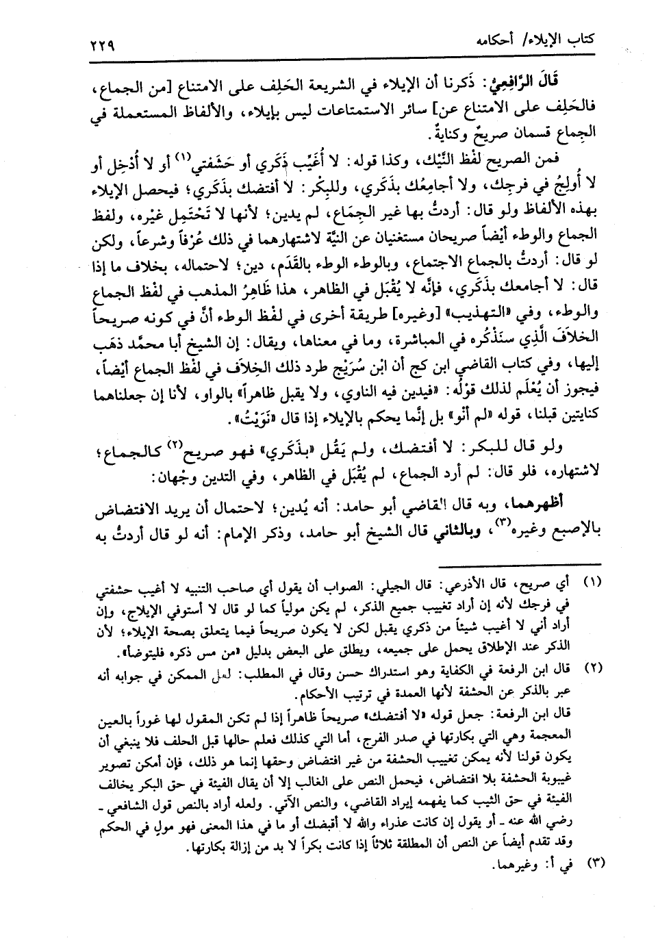 (¬1) أي صريح، قال الأذرعي: قال الجيلي: الصواب أن يقول أي صاحب التنبيه لا أغيب حشفتي في فرجك لأنّه إن أراد تغييب جميع الذكر، لم يكن موليًا كما لو قال لا أستوفي الايلاج، وان أراد أني لا أغيب شيئاً من ذكري يقبل لكن لا يكون صريحاً فيما يتعلق بصحة الإيلاء؛ وإن الذكر عند الإطلاق يحمل على جميعه، ويطلق على البعض بدليل "من مس ذكره فليتوضأ".