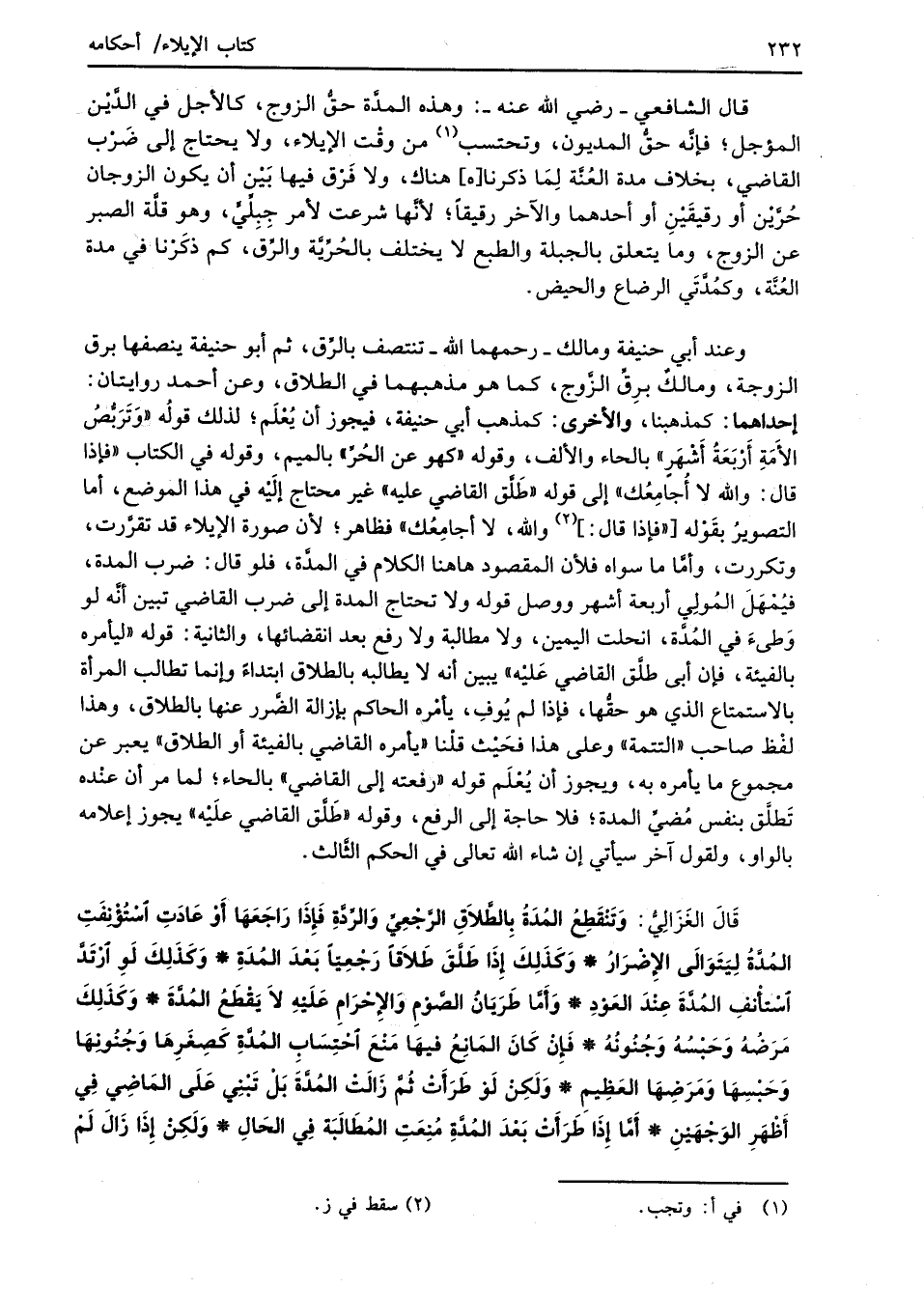 قَالَ الغَزَالِيُّ: وَتَنْقَطِعُ المُدَةُ بِالطَّلاَقِ الرَّجْعِيِّ وَالرِّدَّةِ فَإِذَا رَاجَعَهَا أَوْ عَادَتِ اسْتُؤْنِفَتِ المُدَّةُ لِيَتَوَالَى الإِضْرَارُ* وَكَذَلِكَ إِذَا طَلَّقَ طَلاَقاً رَجْعِيًّا بَعْدَ المُدَةِ* وَكَذَلِكَ لَوِ ارْتَدَّ اسْتأْنفِ المُدَّةَ عِنْدَ العَوْدِ* وَأَمَّا طَرَيَانُ الصَّوْمِ وَالإِحْرَامِ عَلَيْهِ لاَ يَقْطَعُ المُدَّةَ* وَكَذَلِكَ مَرَضُهُ وَحَبْسُهُ وَجُنُونُهُ* فَإِنْ كَانَ المَانِعُ فيهَا مَنْعَ احْتِسَابِ المُدَّةِ كَصِغَرِهَا وَجُنُونِهَا وَحَبْسِهَا وَمَرَضِهَا العَظِيمِ* وَلَكِنْ لَوْ طَرَأَتْ ثُمَّ زَالَتْ المُدَّةَ بَلْ تَبْنِي عَلَى المَاضِي فِي أَظْهَرِ الوَجْهَيْنِ* أَمَّا إِذَا طَرَأَت بَعْدَ المُدَّةِ مُنِعَتِ المُطَالَبَة فِي الحَالِ* وَلَكِنْ إِذَا زَالَ لَمْ