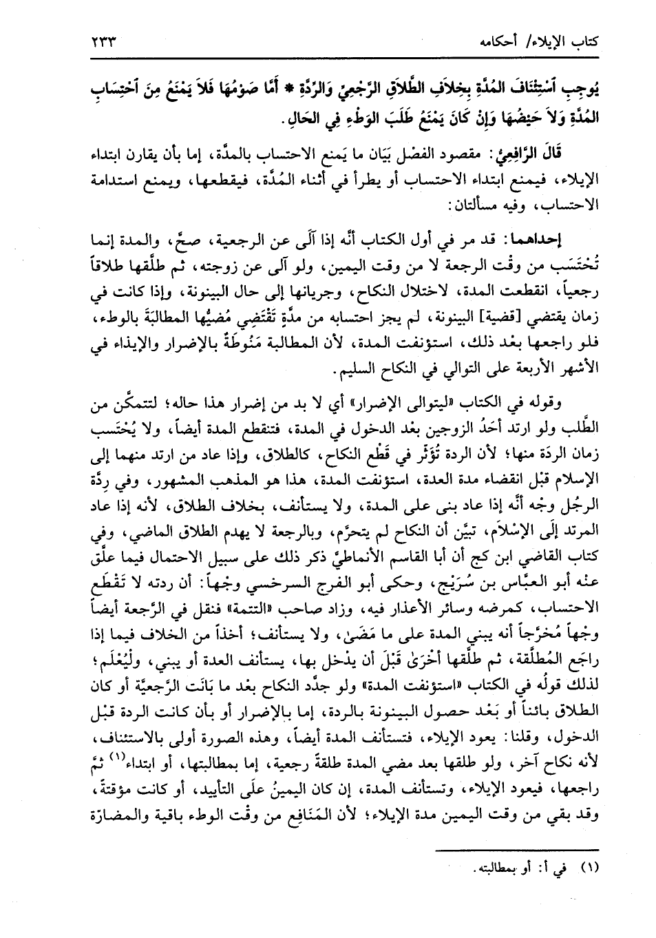 وقوله في الكتاب "ليتوالى الإضرار" أي لا بد من إضرار هذا حاله؛ لتتمكَّن من الطَّلب ولو ارتد أحَدُ الزوجين بعْد الدخول في المدة، فتنقطع المدة أيضاً، ولا يُحْتَسب زمان الردَة منها؛ لأن الردة تؤَثّر في قَطْع النكاح، كالطلاق، وإذا عاد من ارتد منهما إلى الإِسلام قبْل انقضاء مدة العدة، استؤنفت المدة، هذا هو المذهب المشهور، وفي رِدَّة الرجُل وجْه أنَّه إذا عاد بني على المدة، ولا يستأنف، بخلاف الطلاق؛ لأنه إذا عاد المرتد إلَى الإسْلاَم، تبيَّن أن النكاح لم يتحرَّم، وبالرجعة لا يهدم الطلاق الماضي، وفي كتاب القاضي ابن كج أن أبا القاسم الأنماطيَّ ذكر ذلك على سبيل الاحتمال فيما علَّق عنْه أبو العبَّاس بن سُرَيْج، وحكى أبو الفرج السرخسي وجْهًا: أن ردته لا تَقْطَع الاحتساب، كمرضه وسائر الأعذار فيه، وزاد صاحب "التتمة" فنقل في الرَّجعة أيضاً وجْهًا مُخرَّجًا أنه يبني المدة على ما مَضَى، ولا يستأنف؛ أخذاً من الخلاف فيما إذا راجَع المُطلَّقة، ثم طلَّقها أخْرَى قَبْلَ أن يدْخل بها، يستأنف العدة أو يبني، ولْيُعْلَم؛ لذلك قولُه في الكتاب "استؤنفت المدة" ولو جدَّد النكاح بعْد ما بَانَت الرَّجعيَّة أو كان الطلاق بائنًا أو بَعْد حصول البينونة بالردة، إما بالإضرار أو بأن كانت الردة قبْل الدخول، وقلنا: يعود الإيلاء، فتستأنف المدة أيضاً، وهذه الصورة أولى بالاستئناف، لأنه نكاح آخر، ولو طلقها بعد مضي المدة طلقةً رجعية، إما بمطالبتها، أو ابتداء (¬1) ثمَّ راجعها، فيعود الإيلاء، وتستأنف المدة، إن كان اليمينُ علَى التأييد، أو كانت مؤقتةً، وقد بقي من وقت اليمين مدة الإيلاء؛ لأن المَنَافِع من وقْت الوطء باقية والمضارّة