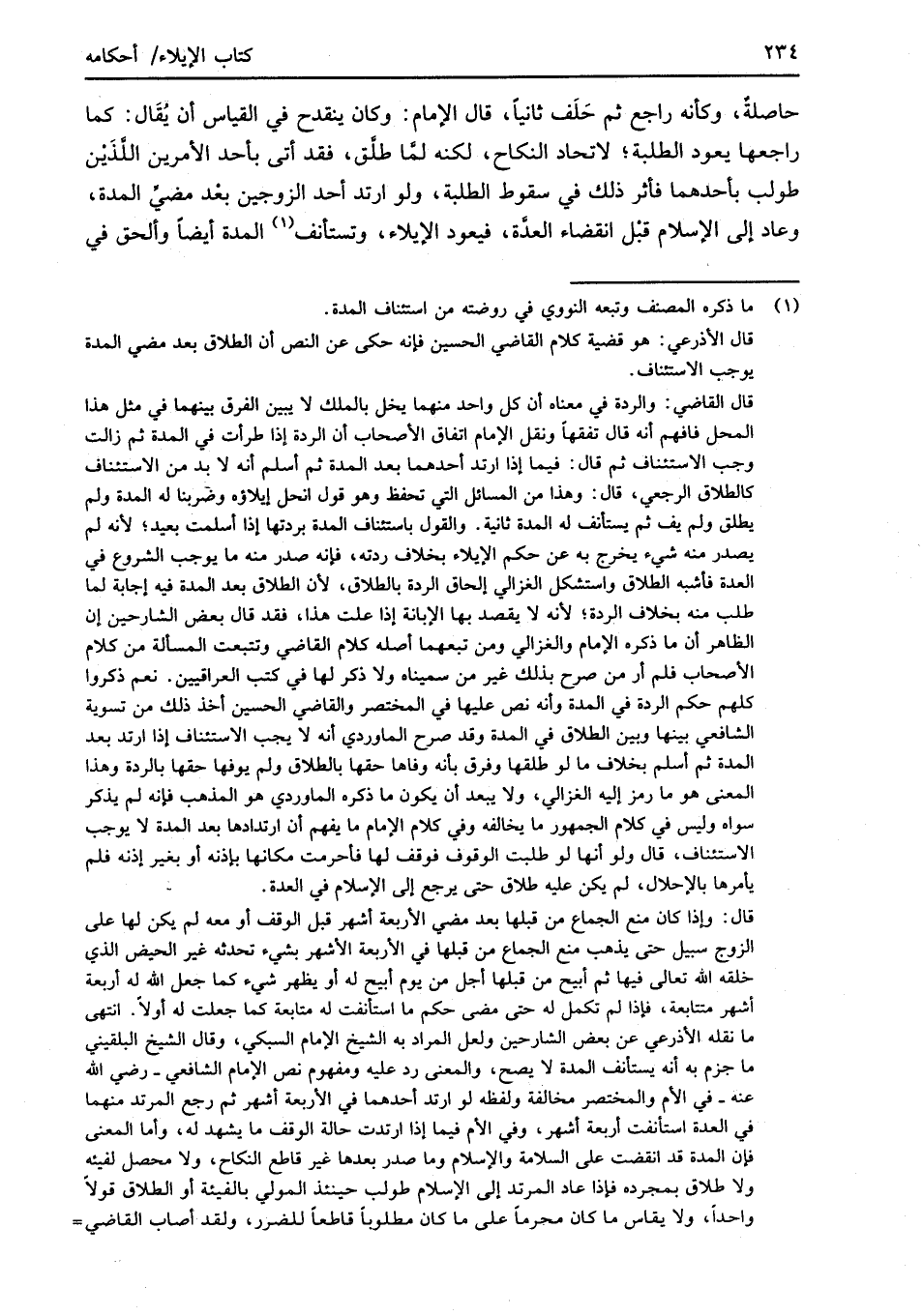 قال القاضي: والردة في معناه أن كل واحد منهما يخل بالملك لا يبين الفرق بينهما في مثل هذا المحل فافهم أنه قال تفقهًا ونقل الإِمام اتفاق الأصحاب أن الردة إذا طرأت في المدة ثم زالت وجب الاستئناف ثم قال: فيما إذا ارتد أحدهما بعد المدة ثم أسلم أنه لا بد من الاستئناف كالطلاق الرجعي، قال: وهذا من المسائل التي تحفظ وهو قول انحل إيلاؤه وضربنا له المدة ولم يطلق ولم يف ثم يستأنف له المدة ثانية. والقول باستئناف المدة بردتها إذا أسلمت بعيد؛ لأنه لم يصدر منه شيء يخرج به عن حكم الإيلاه بخلاف ردته، فإنه صدر منه ما يوجب الشروع في العدة فأشبه الطلاق واستشكل الغزالي إلحاق الردة بالطلاق؛ لأن الطلاق بعد المدة فيه إجابة لما طلب منه بخلاف الردة؛ لأنه لا يقصد بها الإبانة إذا علت هذا، فقد قال بعض الشارحين إن الظاهر أن ما ذكره الإِمام والغزالي ومن تبعهما أصله كلام القاضي وتتبعت المسألة من كلام الأصحاب فلم أر من صرح بذلك غير من سميناه ولا ذكر لها في كتب العراقيين. نعم ذكروا كلهم حكم الردة في المدة وأنه نص عليها في المختصر والقاضي الحسين أخذ ذلك من تسوية الشَّافعي بينها وبين الطلاق في المدة وقد صرح الماوردي أنه لا يجب الاستئناف إذا ارتد بعد المدة ثم أسلم بخلاف ما لو طلقها وفرق بأنه وفاها حقها بالطلاق ولم يوفها حقها بالردة وهذا المعنى هو ما رمز إليه الغزالي، ولا يبعد أن يكون ما ذكره الماوردي هو المذهب فإنه لم يذكر سواه وليس في كلام الجمهور ما يخالفه وفي كلام الإِمام ما يفهم أن ارتدادها بعد المدة لا يوجب الاستئناف، قال ولو أنها لو طلبت الوقوف فوقف لها فأحرمت مكانها بإذنه أو بغير إذنه فلم يأمرها بالإحلال، لم يكن عليه طلاق حتى يرجع إلى الإِسلام في العدة.