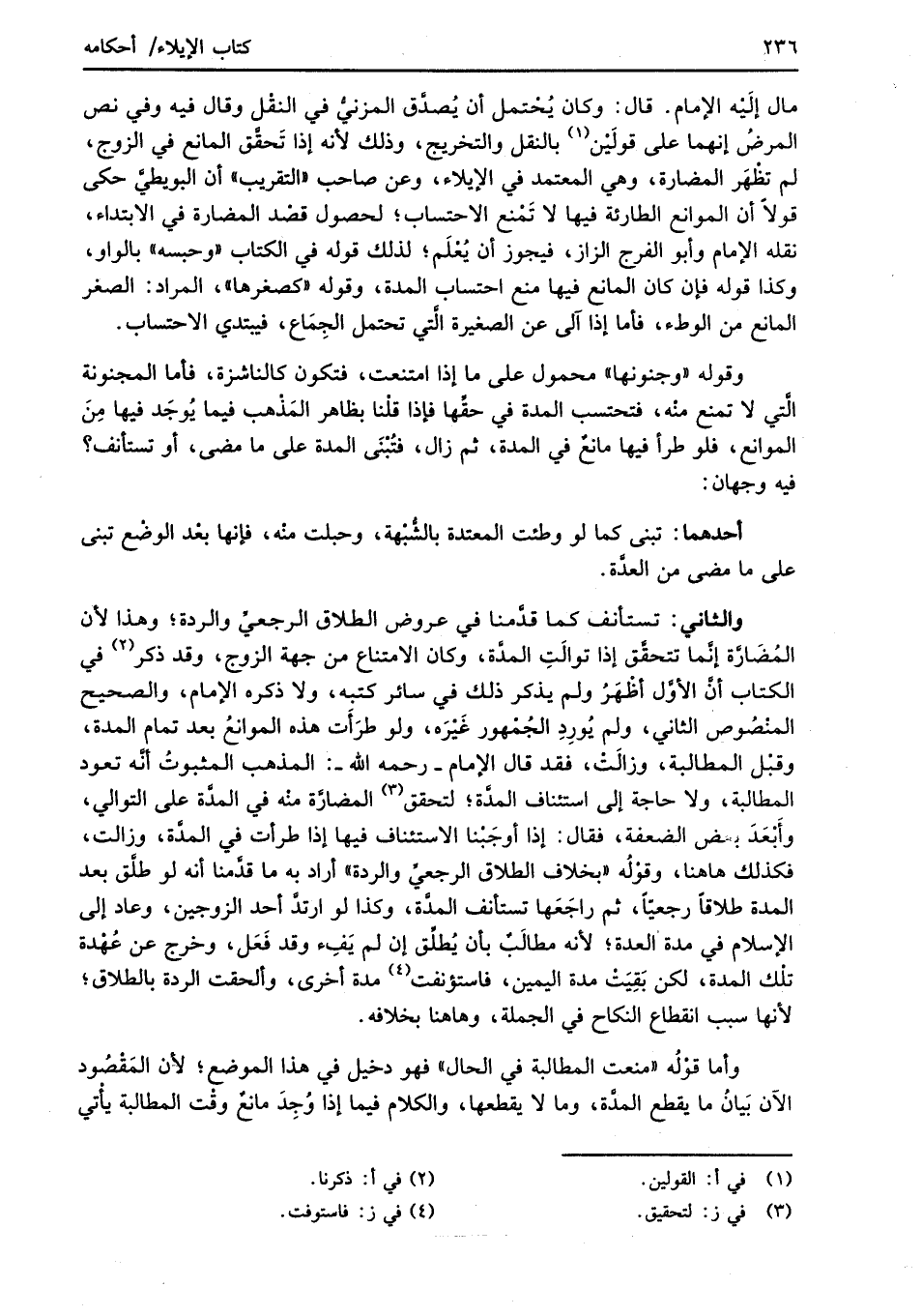 مال إلَيْه الإِمام. قال: وكان يُحْتمل أن يُصدَّق المزنيُّ في النقْل وقال فيه وفي نص المرضُ إنهما على قولَيْن (¬1) بالنقل والتخريج، وذلك لأنه إذا تَحقَّق المانع في الزوج، لم تظْهَر المضارة، وهي المعتمد في الإيلاء، وعن صاحب "التقريب" أن البويطيَّ حكى قولاً أن الموانع الطارئة فيها لا تَمْنع الاحتساب؛ لحصول قصْد المضارة في الابتداء، نقله الإِمام وأبو الفرج الزاز، فيجوز أن يُعْلَم؛ لذلك قوله في الكتاب "وحبسه" بالواو، وكذا قوله فإن كان المانع فيها منع احتساب المدة، وقوله "كصغرها"، المراد: الصغر المانع من الوطء، فأما إذا آلى عن الصغيرة الَّتي تحتمل الجِمَاع، فيبتدي الاحتساب.