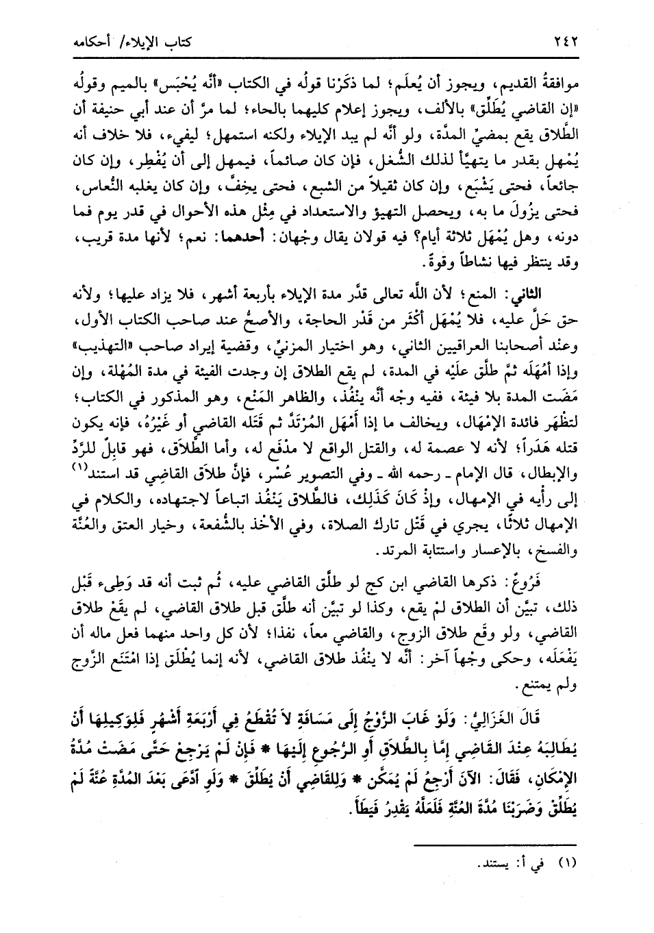 الثاني: المنع؛ لأن الله تعالى قدَّر مدة الإيلاء بأربعة أشهر، فلا يزاد عليها؛ ولأنه حق حَلَّ عليه، فلا يُمْهَل أكْثَر من قَدْر الحاجة، والأصحُّ عند صاحب الكتاب الأول، وعنْد أصحابنا العراقيين الثاني، وهو اختيار المزنيِّ، وقضية إيراد صاحب "التهذيب" وإذا أمُهَلَه ثمَّ طلَّق علَيْه في المدة، لم يقع الطلاق إن وجدت الفيئة في مدة المُهْلة، وإن مَضَت المدة بلا فيئة، ففيه وجْه أنَّه ينْفُذ، والظاهر المَنْع، وهو المذكور في الكتاب؛ لتظْهَر فائدة الإمْهَال، ويخالف ما إذا أَمْهَل المُرْتَدَّ ثم قَتَله القاضي أو غَيْرُهُ، فإنه يكون قتله هَدَرًا؛ لأنه لا عصمة له، والقتل الواقع لا مدْفَع له، وأما الطَّلاَق، فهو قابِلٌ للرَّدِّ والإبطال، قال الإِمام -رحمه الله- وفي التصوير عُسْر، فإنَّ طلاَق القاضِي قد استند (¬1) إلى رأْيه في الإمهال، وإذْ كَانَ كَذَلِك، فالطَّلاق يَنْفُذ اتباعاً لاجتهاده، والكلام في الإمهال ثلاثاً، يجري في قَتْل تارك الصلاة، وفي الأخْذ بالشُّفعة، وخيار العتق والعُنَّة والفسخ، بالإعسار واستتابة المرتد.