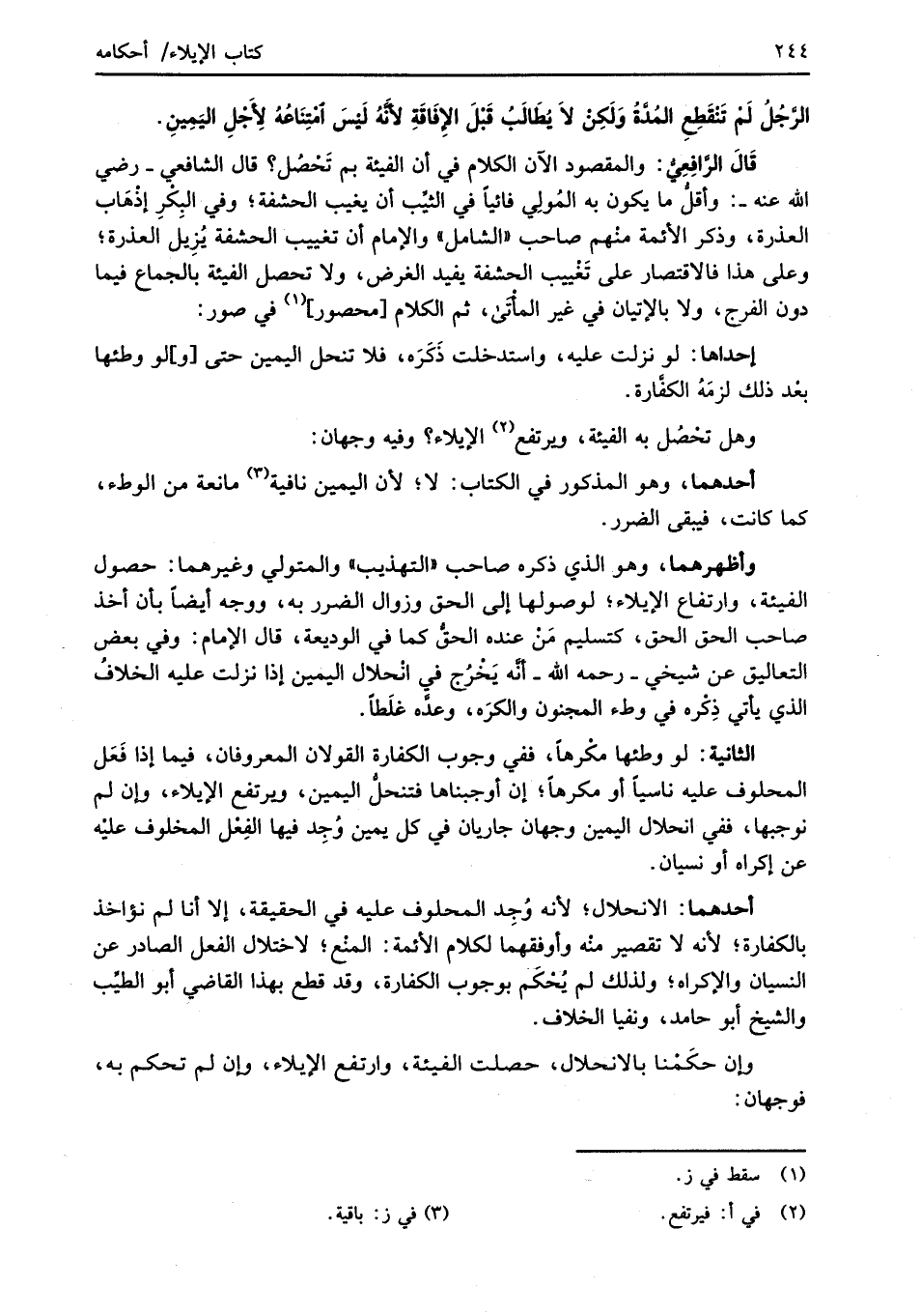 قَالَ الرَّافِعِيُّ: والمقصود الآن الكلام في أن الفيئة بم تَحْصُل؟ قال الشَّافعي -رضي الله عنه -: وأقلُّ ما يكون به المُولِي فائياً في الثيِّب أن يغيب الحشفة؛ وفي البِكْرِ إذْهَاب العذرة، وذكر الأئمة منْهم صاحب "الشامل" والإمام أن تغييب الحشفة يُزِيل العذرة؛ وعلى هذا فالاقتصار على تَغْييب الحشفة يفيد الغرض، ولا تحصل الفيئة بالجماع فيما دون الفرج، ولا بالإتيان في غير المأْتَى، ثم الكلام [محصور] (¬1) في صور: