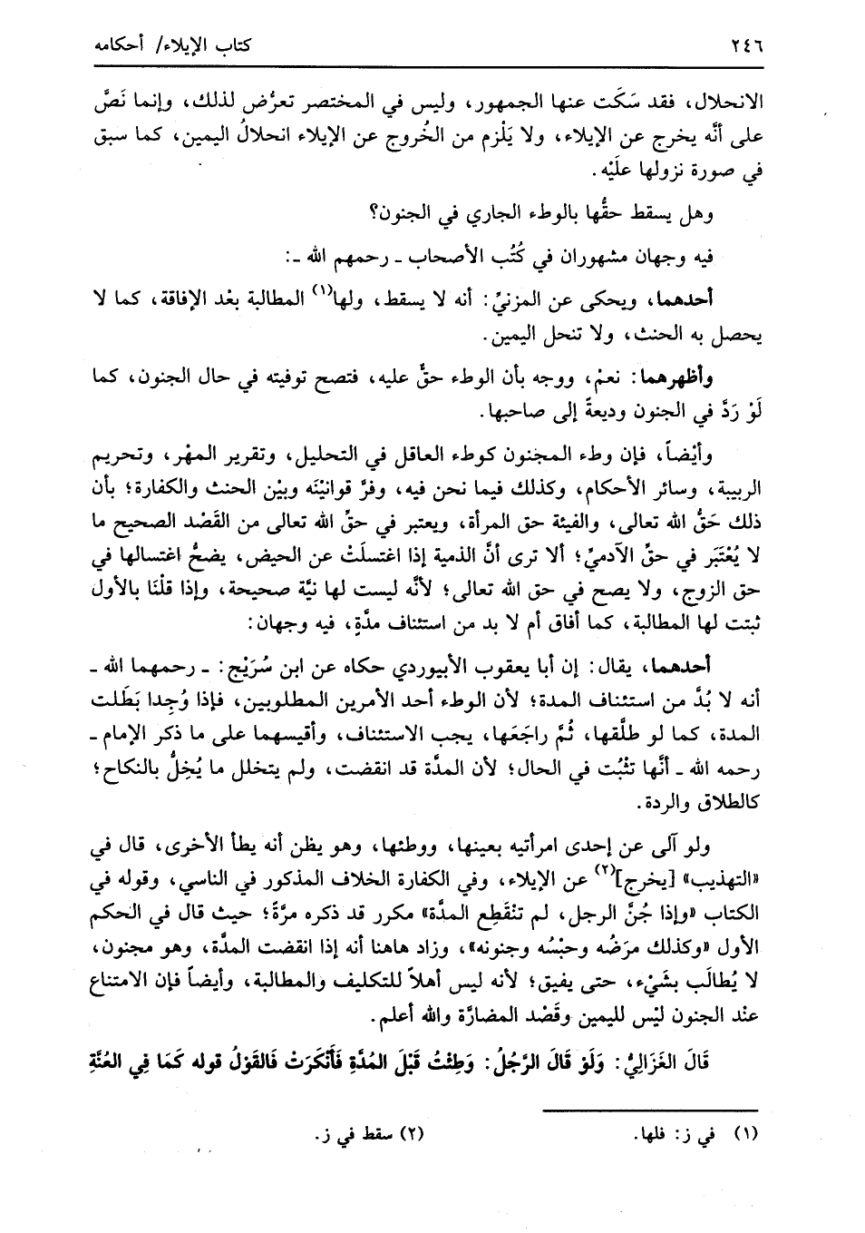وأيْضاً، فإن وطء المجنون كوطء العاقل في التحليل، وتقرير المهْر، وتحريم الربيبة، وسائر الأحكام، وكذلك فيما نحن فيه، وفرَّ قوانيْنَه وبيْن الحنث والكفارة؛ بأن ذلك حَقُّ الله تعالى، والفيئة حق المرأة، ويعتبر في حقِّ الله تعالى من القَصْد الصحيح ما لا يُعْتَبَر في حق الآدميِّ؛ ألا ترى أن الذمية إذا اغتسلَتْ عن الحيض، يصحُّ؛ اغتسالها في حق الزوج، ولا يصح في حق الله تعالى؛ لأنَّه ليست لها نيَّة صحيحة، وإذا قلْنَا بالأول ثبتت لها المطالبة، كما أفاق أم لا بد من استئناف مدَّةٍ، فيه وجهان: