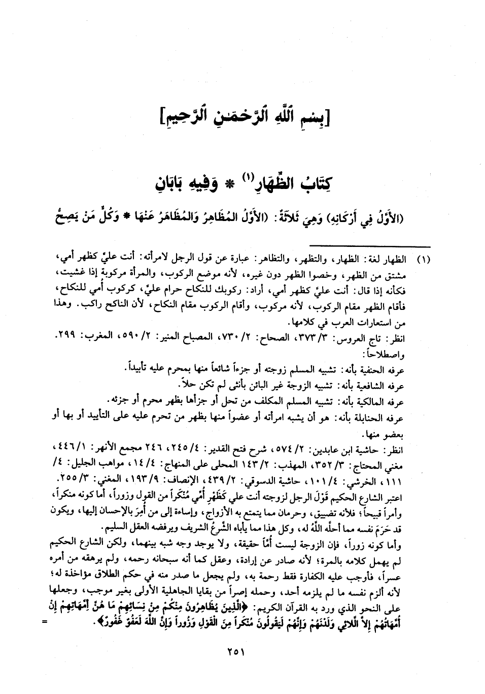 (¬1) الظهار لغة: الظهار، والتظهر، والتظاهر: عبارة عن قول الرجل لامرأته: أنت عليَّ كظهر أمي، مشتق من الظهر، وخصوا الظهر دون غيره؛ لأنه موضع الركوب، والمرأة مركوبة إذا غشيت، فكأنه إذا قال: أنت عليَّ كظهر أمي، أراد: ركوبك للنكاح حرام عليَّ، كركوب أُمي للنكاح، فأقام الظهر مقام الركوب؛ لأنه مركوب، وأقام الركوب مقام النكاح؛ لأن الناكح راكب. وهذا من استعارات العرب في كلامها.