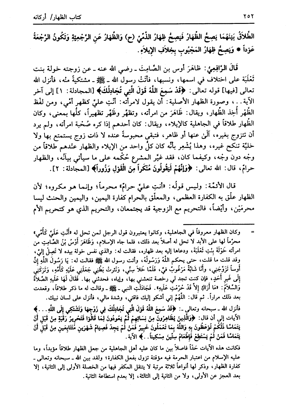 قَالَ الرَّافِعِيُّ: ظاهَرَ أوس بن الصَّامِتَ -رضي الله عنه- عن زوجته خولة بنت ثَعْلَبَة على اختلاف في اسمها، ونسبها، فأتَتْ رسول الله -صلى الله عليه وسلم- مشتكيةً منه، فأنزل الله تعالى [فيها] قوله تعالى: {قَدْ سَمِعَ الله قَوْلَ الَّتِي تُجَادِلُكَ} [المجادلة: 1] إلى آخر الآية .. ، وصورة الظهار الأصلية: أن يقول لامرأته: أنْتِ عليَّ كظهر أمِّي، ومن لفظ الظَّهْر أُخِذ الظِّهار، ويقال: ظَاهَرَ من امرأته، وتظهَّر وظَهَّر تظهيرًا، كلُّها بمعنى، وكان الظِّهار طلاقًا في الجاهلية كالإيلاء، ويقال: كان أحدهم إذا كره صُحْبة امرأته، ولم يرد أن تتزوج بغيره، آلَى عنها أو ظاهر، فتبقى محبوسةً عنده لا ذات زوج يستمتع بها ولا خليَّة تنكح غيره، وهذا يُشْعِر بأنَّه كان كلُّ واحد من الإيلاء والظِّهار عنْدهم طلاقًا من وجْه دون وجْه، وكيفما كان، فقد غيَّر المشرع حُكْمه على ما سيأتي بيانه، والظِّهار حرامٌ، قال: الله تعالى: {وَإِنَّهُمْ لَيَقُولُونَ مُنْكَرًا مِنَ الْقَوْلِ وَزُورًا} [المجادلة: 2]