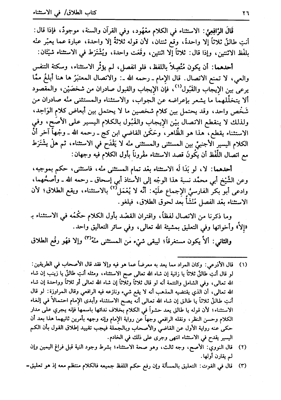 قَالَ الرَّافِعِيُّ: الاستثناء في الكلام معْهُود، وفي القرآن والسنة، موجودٌ، فإذا قال: أنتِ طالقٌ ثلاثاً إلا واحدةً، وقع ثنتان؛ لأن قوله ثلاثةٌ إلا واحدة، عبارة عما يعبّر عنْه بلفْظ الاثنتين، وإذا قال: ثلاثاً إلا اثنتين، وقَعَت واحدة، وُيشْتَرَط في الاستثناء شيْئَان: