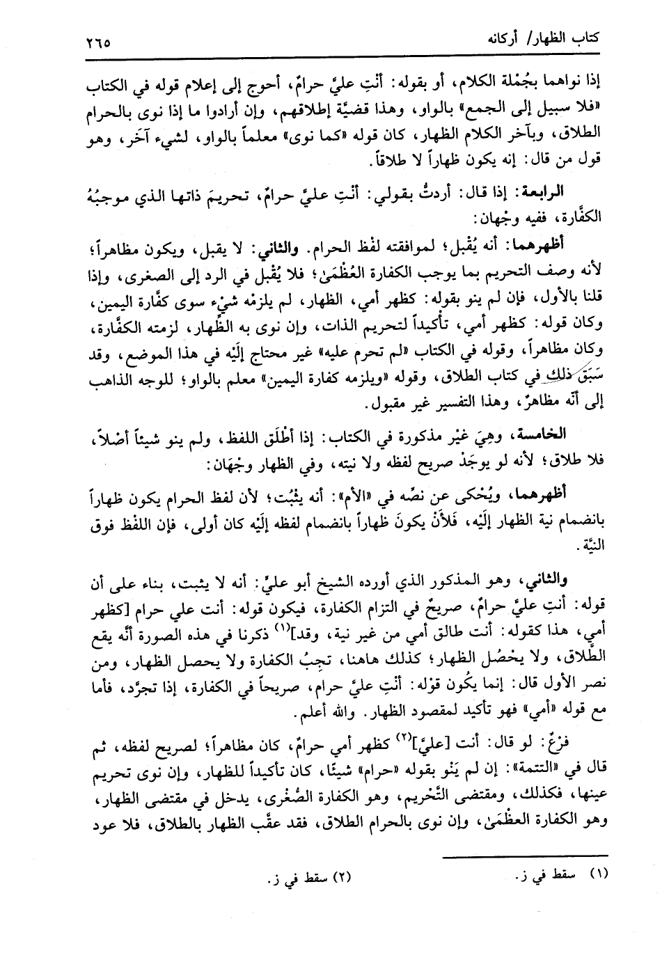 أظهرهما: أنه يُقبل؛ لموافقته لفْظ الحرام. والثاني: لا يقبل، ويكون مظاهرًا؛ لأنه وصف التحريم بما يوجب الكفارة العُظْمَى؛ فلا يُقْبل في الرد إلى الصغرى، وإذا قلنا بالأول، فإن لم ينو بقوله: كظهر أمي، الظهار، لم يلزمْه شيْء سوى كفَّارة اليمين، وكان قوله: كظهر أمي، تأْكيدًا لتحريم الذات، وإن نوى به الظِّهار، لزمته الكفَّارة، وكان مظاهرًا، وقوله في الكتاب "لم تحرم عليه" غير محتاج إلَيْه في هذا الموضع، وقد سَبَق ذلك في كتاب الطلاق، وقوله "ويلزمه كفارة اليمين" معلم بالواو؛ للوجه الذاهب إلى أنّه مظاهرٌ، وهذا التفسير غير مقبول.
