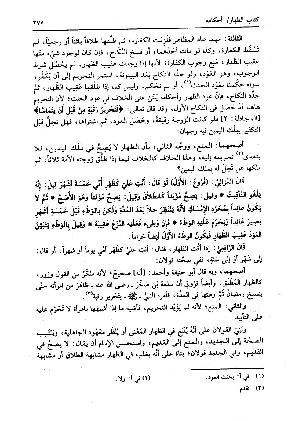الثالثة: مهما عاد المظاهر فلَزِمَت الكفارة، ثم طلَّقها طلاقًا بائنًا أو رجعيًّا، لم تَسْقُط الكفارة، وكذا لو مات أحَدُهما، أو فسخ النِّكَاح، فإن كان لوجود شيْء منْها عقيب الظهار، مُنِع وجوب الكفارة؛ لأنها إذا وجدت عقيب الظهار، لم يحْصُل شرط الوجوب، وهو العَوْد، ولو جدَّد النكاح بَعْد البينونة، استمر التحريم إلى أن يُكَفِّر، سواء حكَمنا بعَوْد الحنث (¬1)، أو لم نحْكم، وليس كما إذا طلَّقها عَقِيب الظِّهار، ثمَّ جدَّد النكاح، فإنَّ عود الظهار وأحكامه يُبْنَى على الخلاف في عود الحنث؛ لأن التحريم هاهنا قَدْ حَصَل في النكاح الأول، وقد قال تعالى: {فَتَحْرِيرُ رَقَبَةٍ مِنْ قَبْلِ أَنْ يَتَمَاسَّا} [المجادلة: 2] فلو كانت الزوجة رقيقة، وحَصَل العود، ثم اشتراها، فهل تحِلُّ قبْل التكفير بمِلْك اليمين فيه وجهان: