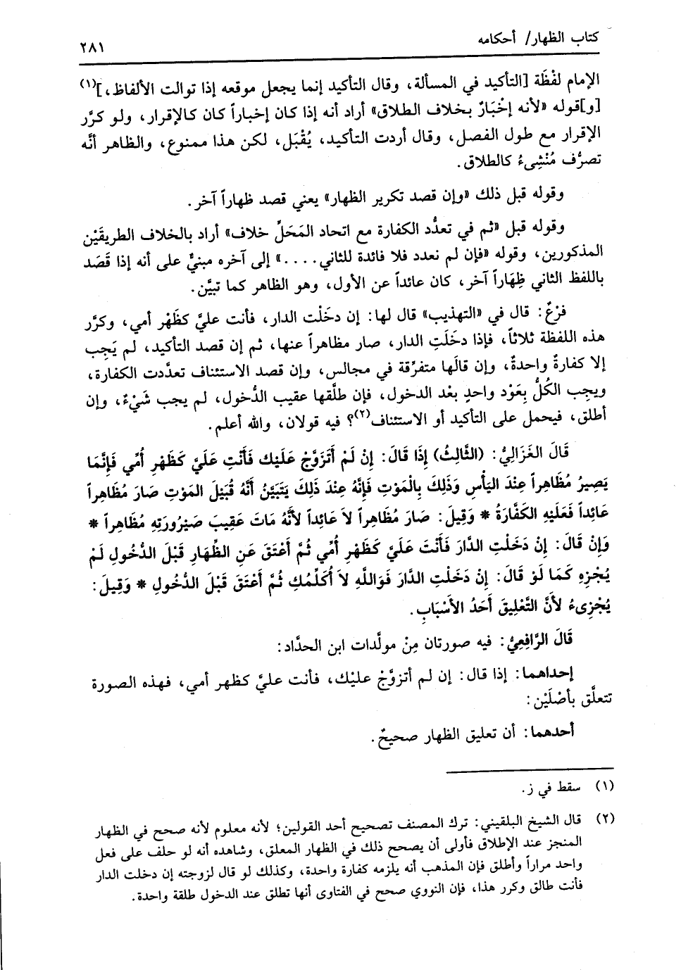 (¬2) قال الشيخ البلقيني: ترك المصنف تصحيح أحد القولين؛ لأنه معلوم لأنه صحح في الظِّهار المنجز عند الإطلاق فأولى أن يصحح ذلك في الظِّهار المعلق، وشاهده أنه لو حلف على فعل واحد مرارًا وأطلق فإن المذهب أنه يلزمه كفارة واحدة، وكذلك لو قال لزوجته إن دخلت الدار فأنت طالق وكرر هذا، فإن النووي صحح في الفتاوى أنها تطلق عند الدخول طلقة واحدة.