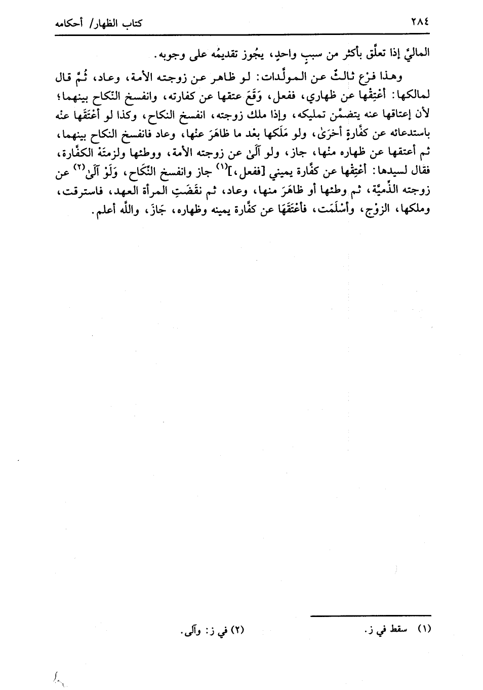 وهذا فرْع ثالثٌ عن المولَّدات: لو ظاهر عن زوجته الأمة، وعاد، ثُمَّ قال لمالكها: أعْتِقْها عن ظهاري، ففعل، وَقَعَ عتقها عن كفارته، وانفسخ النِّكاح بينهما؛ لأن إعتاقها عنه يتضمَّن تمليكه، وإذا ملك زوجته، انفسخ النكاح، وكذا لو أعْتَقَها عنْه باستدعائه عن كفَّارةٍ أخرَى، ولو مَلَكها بعْد ما ظاهَرَ عنْها، وعاد فانفسخ النكاح بينهما، ثم أعتقها عن ظهاره منْها، جاز، ولو آلَى عن زوجته الأمة، ووطئها ولزمتَه الكفَّارة، فقال لسيدها: أعْتِقْها عن كفَّارة يميني [ففعل،] (¬1) جاز وانفسخ النِّكَاح، وَلَوْ آلَى (¬2) عن زوجته الذِّميَّة، ثم وطئها أو ظاهَرَ منها، وعاد، ثم نقَضَتِ المرأة العهد، فاسترقت، وملكها، الزوْج، وأسْلَمَت، فأعْتَقَهَا عن كفَّارة يمينه وظهاره، جَازَ، والله أعلم.