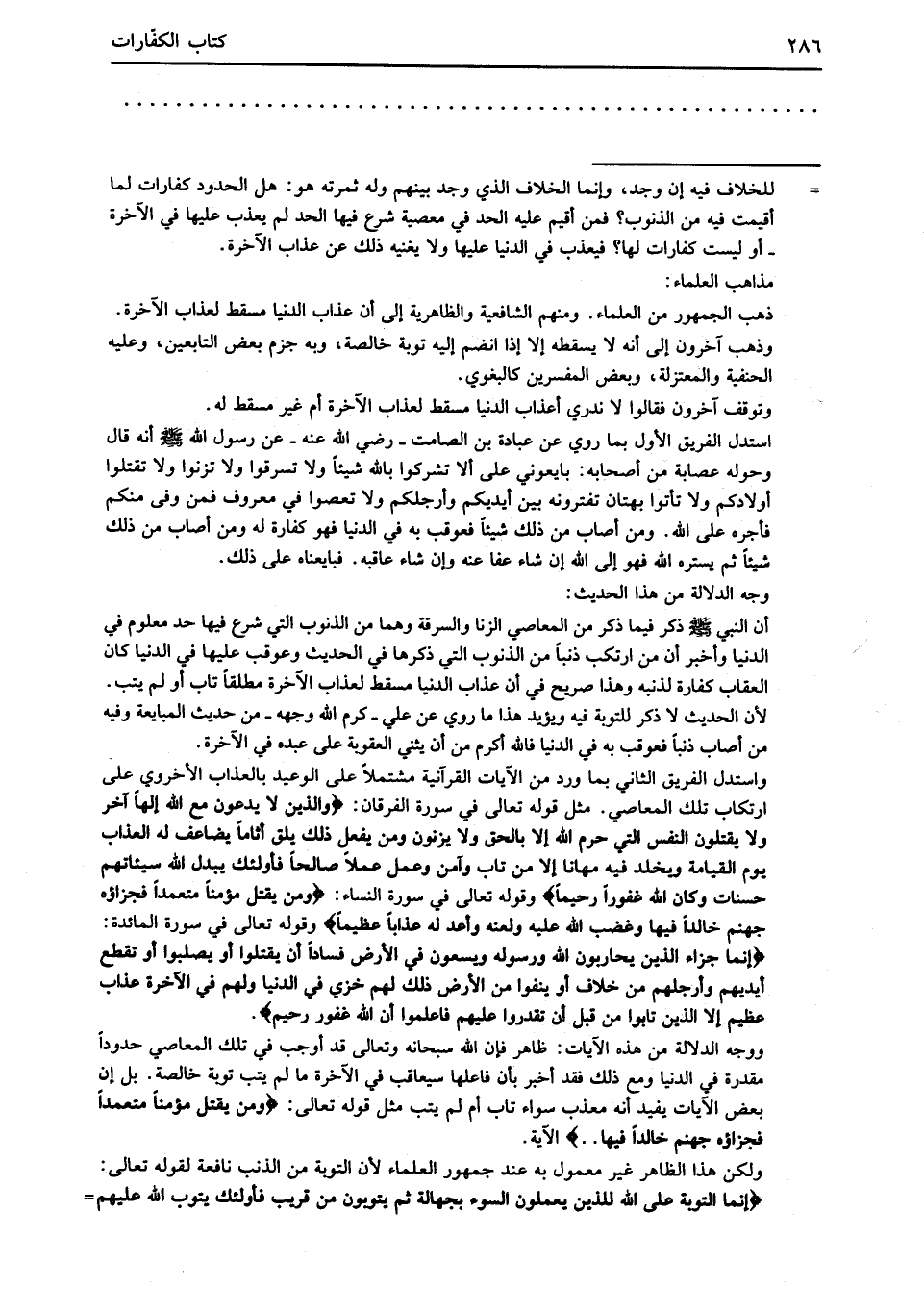 واستدل الفريق الثاني بما ورد من الآيات القرآنية مشتملاً على الوعيد بالعذاب الأخروي على ارتكاب تلك المعاصي. مثل قوله تعالى في سورة الفرقان: {وَالَّذِينَ لَا يَدْعُونَ مَعَ اللَّهِ إِلَهًا آخَرَ وَلَا يَقْتُلُونَ النَّفْسَ الَّتِي حَرَّمَ اللَّهُ إِلاَّ بِالْحَقِّ وَلَا يَزْنُونَ وَمَنْ يَفْعَلْ ذَلِكَ يَلْقَ أَثَامًا (68) يُضَاعَفْ لَهُ الْعَذَابُ يَوْمَ الْقِيَامَةِ وَيَخْلُدْ فِيهِ مُهَانًا (69) إِلاَّ مَنْ تَابَ وَآمَنَ وَعَمِلَ عَمَلًا صَالِحًا فَأُولَئِكَ يُبَدِّلُ اللَّهُ سَيِّئَاتِهِمْ حَسَنَاتٍ وَكَانَ اللَّهُ غَفُورًا رَحِيمًا} وقوله تعالى في سورة النساء: {وَمَنْ يَقْتُلْ مُؤْمِنًا مُتَعَمِّدًا فَجَزَاؤُهُ جَهَنَّمُ خَالِدًا فِيهَا وَغَضِبَ اللَّهُ عَلَيْهِ وَلَعَنَهُ وَأَعَدَّ لَهُ عَذَابًا عَظِيمًا} وقوله تعالى في سورة المائدة: {إِنَّمَا جَزَاءُ الَّذِينَ يُحَارِبُونَ اللَّهَ وَرَسُولَهُ وَيَسْعَوْنَ فِي الْأَرْضِ فَسَادًا أَنْ يُقَتَّلُوا أَوْ يُصَلَّبُوا أَوْ تُقَطَّعَ أَيْدِيهِمْ وَأَرْجُلُهُمْ مِنْ خِلَافٍ أَوْ يُنْفَوْا مِنَ الْأَرْضِ ذَلِكَ لَهُمْ خِزْيٌ فِي الدُّنْيَا وَلَهُمْ فِي الْآخِرَةِ عَذَابٌ عَظِيمٌ (33) إِلَّا الَّذِينَ تَابُوا مِنْ قَبْلِ أَنْ تَقْدِرُوا عَلَيْهِمْ فَاعْلَمُوا أَنَّ اللَّهَ غَفُورٌ رَحِيمٌ}.