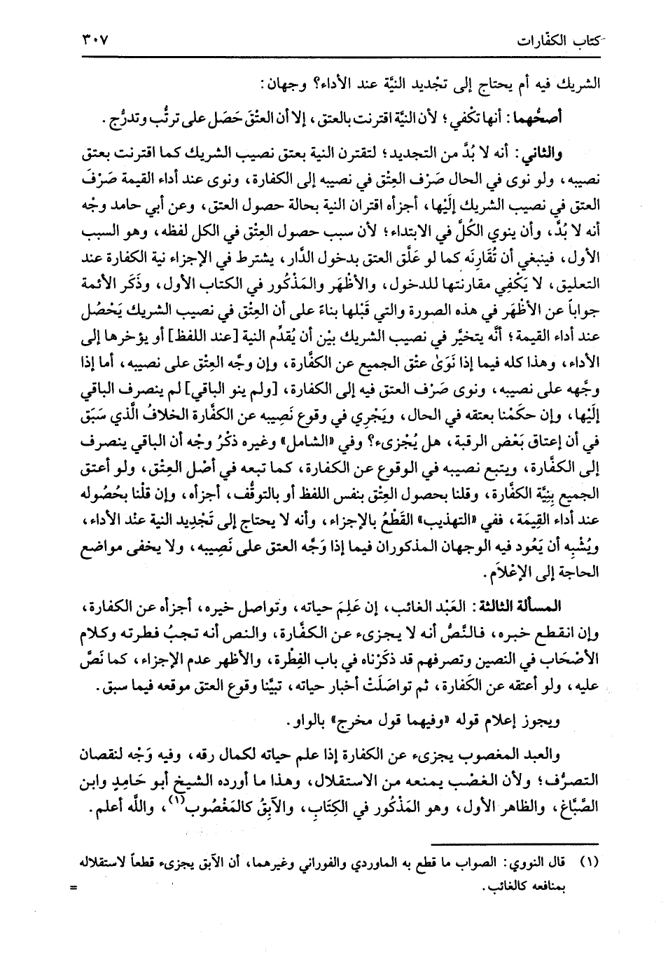 والثاني: أنه لا بُدَّ من التجديد؛ لتقترن النية بعتق نصيب الشريك كما اقترنت بعتق نصيبه، ولو نوى في الحال صَرْف العِتْق في نصيبه إلى الكفَّارة، ونوى عند أداء القيمة صَرْفَ العتق في نصيب الشريك إلَيْها، أجزأه اقتران النية بحالة حصول العتق، وعن أبي حامد وجْه أنه لا بُدَّ، وأن ينوي الكُلَّ في الابتداء؛ لأن سبب حصول العِتْق في الكل لفظه، وهو السبب الأول، فينبغي أن تُقَارِنَه كما لو عَلَّق العتق بدخول الدَّار، يشترط في الإجزاء نية الكفَّارة عند التعليق، لا يَكْفِي مقارنتها للدخول، والأظْهَر والمَذْكُور في الكتاب الأول، وذَكَر الأئمة جواباً عن الأظْهَر في هذه الصورة والتي قَبْلها بناءً على أن العِتْق في نصيب الشريك يَحْصُل عند أداء القيمة؛ أنَّه يتخيَّر في نصيب الشريك بيْن أن يُقدِّم النية [عند اللفظ] أو يؤخرها إلى الأداء، وهذا كله فيما إذا نَوَى عتْق الجميع عن الكفَّارة، وإن وجَّه العِتْق على نصيبه، أما إذا وجَّهه على نصيبه، ونوى صَرْف العتق فيه إلى الكفَّارة، [ولم ينو الباقي] لم ينصرف الباقي إلَيْها، وإن حكَمْنا بعتقه في الحال، وَيجْرِي في وقوع نَصِيبه عن الكفَّارة الخلاف الَّذي سَبَق في أن إعتاق بَعْض الرقبة، هل يُجْزئ؟ وفي "الشامل" وغيره ذكْرُ وجْه أن الباقي ينصرف إلى الكفَّارة، ويتبع نصيبه في الوقوع عن الكفَّارة، كما تبعه في أصْل العِتْق، ولو أعتق الجميع بِنِيَّة الكفَّارة، وقلنا بحصول العِتْق بنفس اللفظ أو بالتوقُّف، أجزأه، وإن قلْنا بحُصُوله عند أداء القِيمَة، ففي "التهذيب" القَطْعُ بالإجزاء، وأنه لا يحتاج إلى تَجْدِيد النية عنْد الأداء، ويُشْبِه أن يَعُود فيه الوجهان المذكوران فيما إذا وَجَّه العتق على نَصِيبه، ولا يخفى مواضع الحاجة إلى الإعْلاَم.