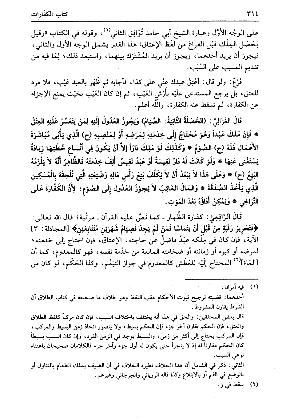 قَالَ الغَزَالِيُّ: (الخَصْلَةُ الثَّانِيَةُ: الصِّيَامُ) وَيَجُوزُ العُدُولُ إِلَيْهِ لِمَنْ يَتَعَسَّرُ عَلَيْهِ العِتْقُ* فَإِنْ مَلَكَ عَبْدًا وَهُوَ مُحْتَاجٌ إِلَى خِدْمَتِهِ لِمَرَضِهِ أَوْ لِمَنْصِبِهِ (ح) الَّذِي يَأْبَى مُبَاشَرَةَ الأَعْمَالِ فَلَهُ (ح) الصَّوْمُ* وَكذَلِكَ لَوْ مَلِكَ دَارًا إلاَّ أنْ يَكُونَ فِي اتِّسَاعِ خُطَّتِهَا زِيَادَةٌ يُسْتَغْنى عَنِهَا* وَلَوْ كَانَتْ لَهُ دَارٌ نَفِيسَةٌ أَوْ عَبْدٌ نَفِيسٌ أَلِفَ خِدْمَتَهُ فَالظَّاهِرُ أنَّهُ لا يَلْزَمُهُ البَيْعُ (ح) * وَعَلَى هَذَا لاَ يَبْعُدُ أَنْ لاَ يُكَلَّفَ بَيْعَ رَأْسِ مَالِهِ وَضَيْعَتِهِ الَّتِي تُلْحِقُهُ بالْمُسْكِينِ الَّذِي يَأْخُذُ الصَّدَقَةَ* وَالمَالُ الغَائِبُ لاَ يُجَوِّزُ العُدُولَ إِلَى الصَّوْمِ؛ لأَنَّ الكَفَّارَةَ عَلَى التَّرَاخِي* وَيُمْكِنُ أَدَاؤُه بَعْدَ المَوْتِ.