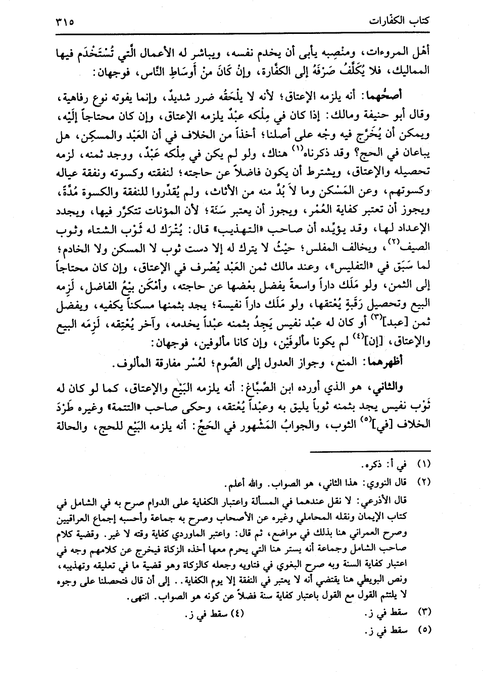 أهْل المروءات، ومنْصِبه يأبى أن يخدم نفسه، ويباشر له الأعمال الَّتي تُسْتَخْدَم فيها المماليك، فلا يُكَلَّفُ صَرْفَهُ إلى الكفَّارة، وإنْ كَانَ من أَوسَاطِ النَّاس، فوجهان: