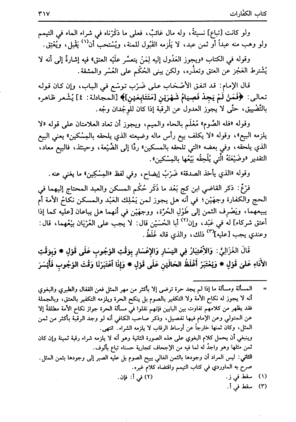 وقوله "فله الصَّوم" مُعْلَم بالحاء والميم، ويجوز أن تعاد العلامتان على قوله "لا يلزمه البيع"، وقوله "لا يكلف بيع رأس ماله وضيعته الذي يلحقه بالمِسْكين" يعني البيع الذي يلحقه، وفي بعضه "التي تلحقه بالمسكين" ردا إلى الضَّيْعة، وحينئذ، فالبيع معاد، التقدير "وضَيْعَتَهُ الَّتي يُلْحِقُه بَيْعُها بالمِسْكين".