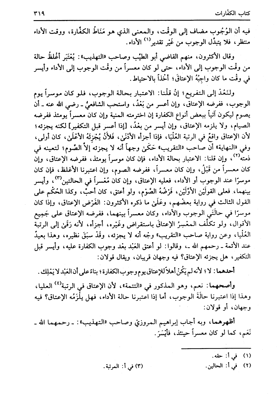 ولنَعُدْ إلى التفريع؛ إنْ قلْنا: الاعتبار بحالة الوجوب، فلو كان موسرًا يوم الوجوب، ففرضه الإعتاق، وإن أعسر من بَعْدُ، واستحب الشَّافعيُّ -رضي الله عنه- أن يصوم ليكون آتياً ببعض أنواع الكفَّارة إن اخترمته المنية وإن كان معسراً يومئذ ففرضه الصيام، ولا يلزمه الإعتاق، وإن أيسر من بعْدُ، [إذا أعسر قبل التكفير] لكنه يجزئه؛ لأن الإعتاق واقعٌ في الرتبة العُلْيَا، فإذا أجزأه الأدْنَى، فَلأَنْ يُجْزِئَهُ الأعْلَى، كان أولى، وفي "النهاية" أن صاحب "التقريب" حَكَى وجهاً أنه لا يجزئه إلاَّ الصَّوم؛ لتعينه في ذمته (¬1)، وإن قلنا: الاعتبار بحالة الأداء، فإن كان موسرًا يومئذ، ففرضه الإعتاق، وإن كان معسرا من قَبْلُ، وإن كان معسرًا، ففرضه الصوم، وإن اعتبرنا الأغلظ، فإن كان موسرًا عند الوجوب أو الأداء، فعليه الإعتاق، وإن كان مُعْسرًا في الحالتين (¬2)، وأيسر بينهما، فعلى القولَيْن الأوَّلَيْن، فَرْضُهُ الصَّوْم، ولو أعتق، كان أحبَّ، وكذا الحُكْم على القول الثالث في رواية بعضْهم، وعَلَى ما ذكره الأكثرون: الفَرْض الإعتاق، وإذا كان موسرًا في حالَتَي الوجوب والأداء، وكان معسرًا بينهما، ففرضه الإعتاق على جَمِيع الأقوال، ولو تكلَّف المعْسِرُ الإعتاقَ باستقراض وغَيْره، أجزأه؛ لأنه رَقَى إلى الرتبة العُلْيا، وعن رواية صاحب "التقريب" وجْه أنه لا يجزئه، وقَدْ سبَقَ نظيره، وهذا بعيدٌ عند الأئمة -رحمهم الله-، وقالوا: لو أعتق العَبْد بعْد وجوب الكفَّارة عليه، وأيسر قبل التكفير، هل يجزئه الإعتاق؟ فيه وجهان قريبان، ويقال قولان: