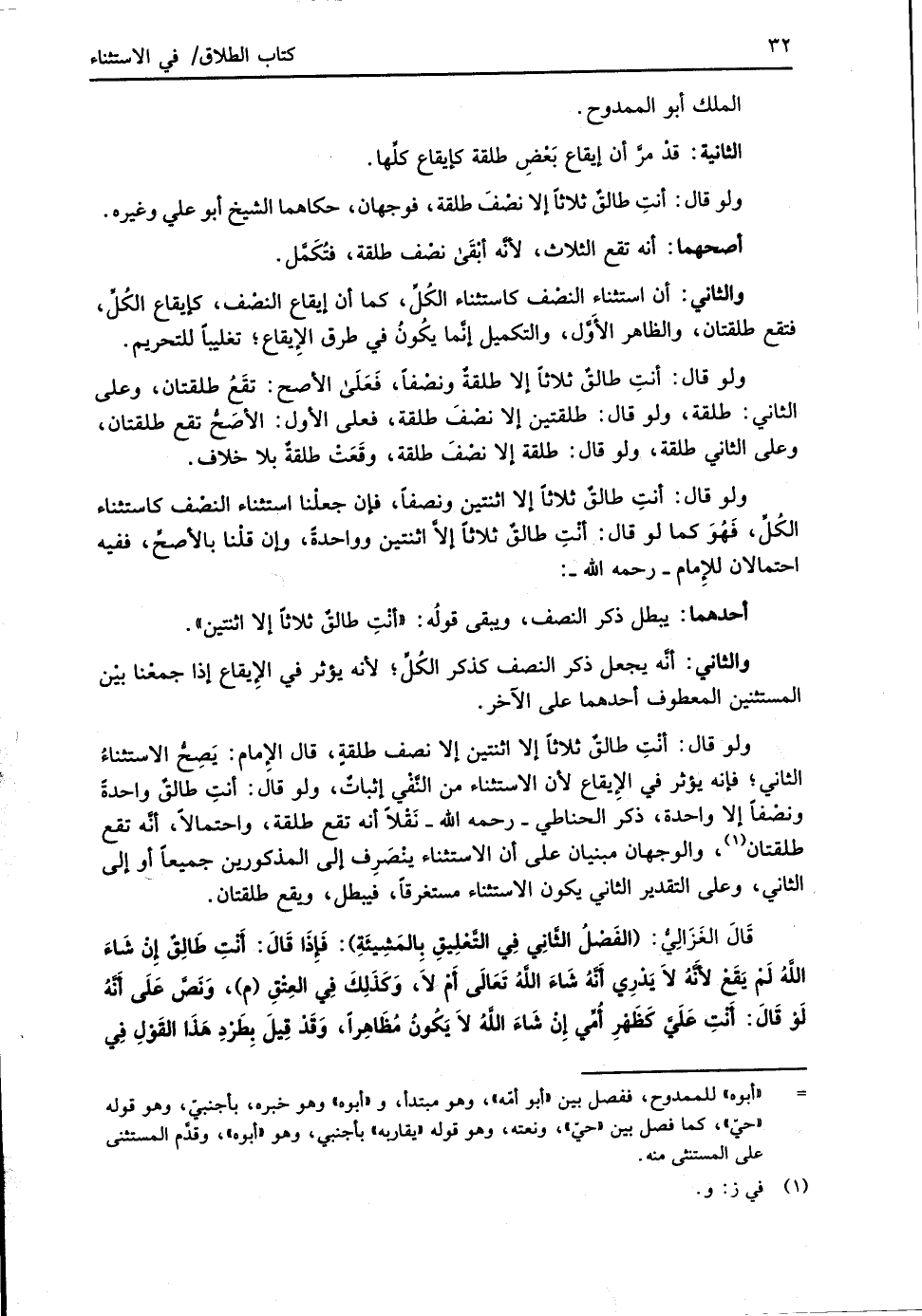 قَالَ الغَزَالِيُّ: (الفَصْلُ الثَّانِي في التَّعْلِيقِ بِالمَشِيئَةِ): فَإذَا قَالَ: أَنْتِ طَالِقٌ إنْ شَاءَ اللهُ لَمْ يَقَعْ لأَنَّهُ لاَ يَدْرِي أنَّهُ شَاءَ الله تَعَالَى أَمْ لاَ، وَكَذَلِكَ في العِتْقِ (م)، وَنَصَّ عَلَى أنَّهُ لَوْ قَالَ: أَنْتِ عَلَيَّ كَظَهْرِ أُمِّي إنْ شَاءَ اللهُ لاَ يَكُونُ مُظَاهِراً، وَقَدْ قِيلَ بِطَرْدِ هَذَا القَوْلِ فِي