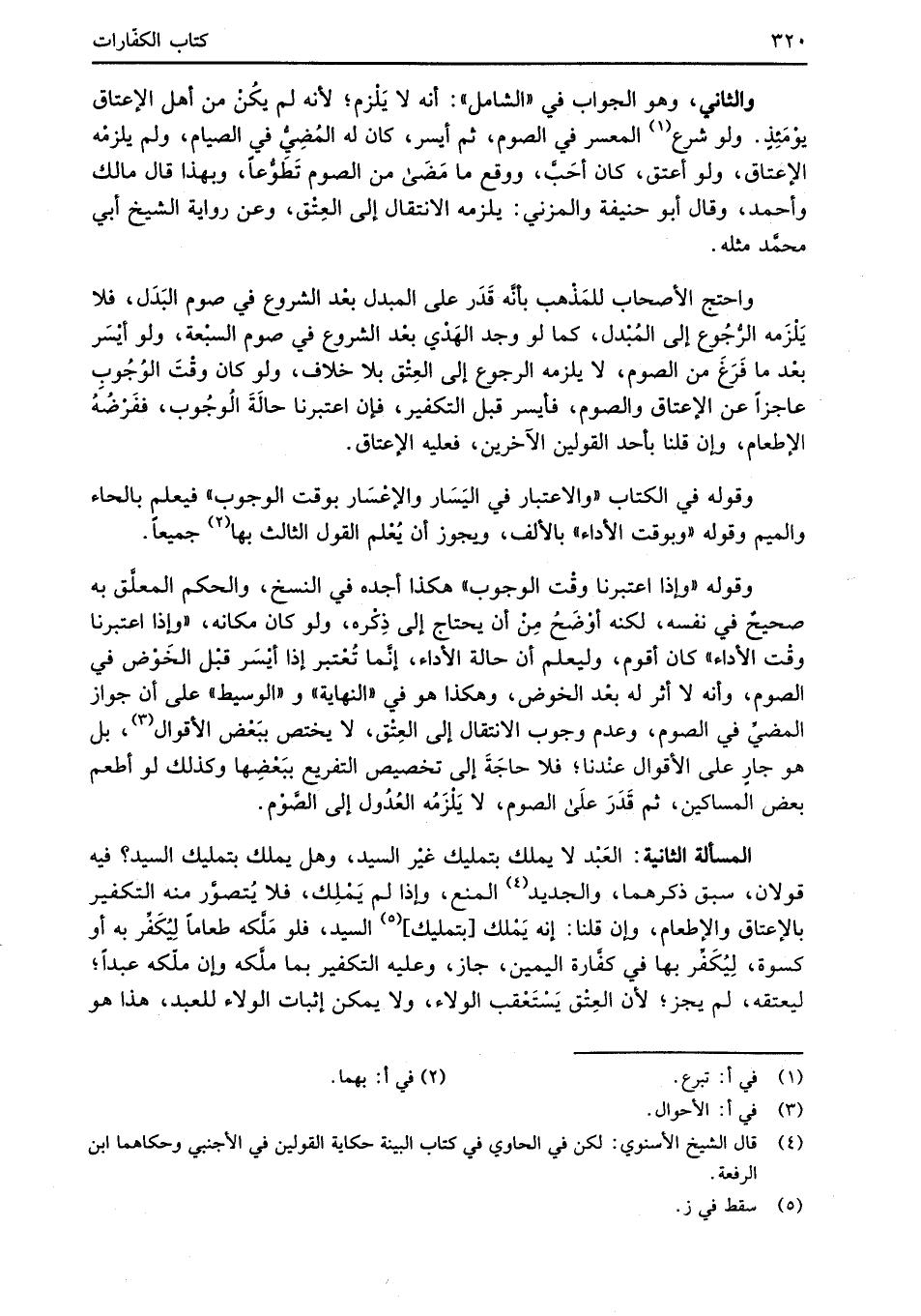 وقوله في الكتاب "والاعتبار في اليَسَار والإعْسَار بوقت الوجوب" فيعلم بالحاء والميم وقولها "وبوقت الأداء" بالألف، ويجوز أن يُعْلم القول الثالث بها (¬2) جميعاً.