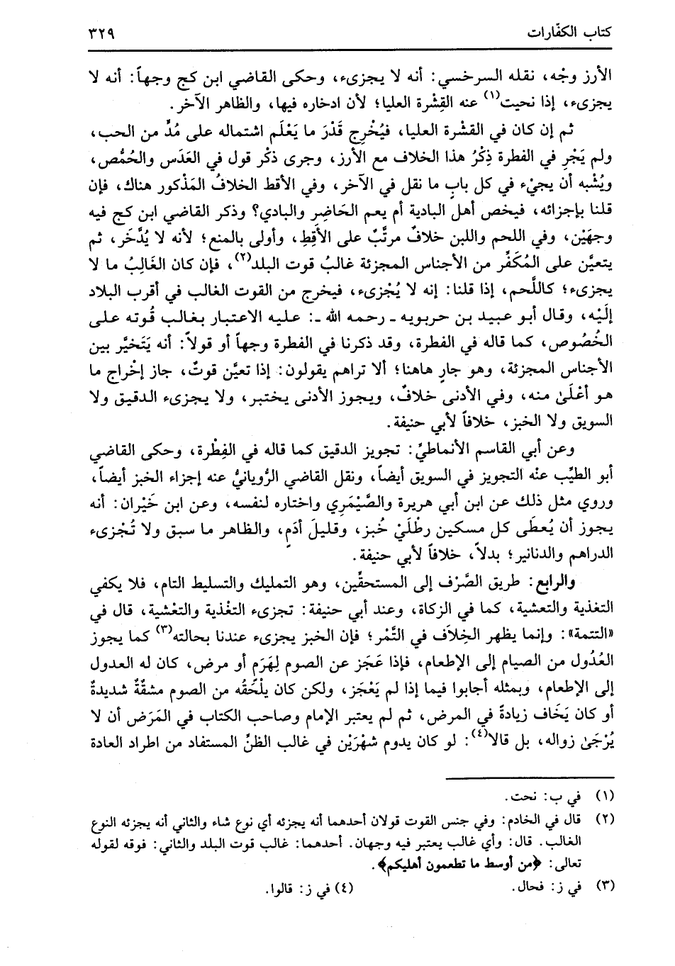 ثم إن كان في القشْرة العليا، فيُخْرِج قَدْرَ ما يَعْلَم اشتماله على مُدٍّ من الحب، ولم يَجْرِ في الفطرة ذِكْرُ هذا الخلاف مع الأرز، وجرى ذكْر قول في العَدَس والحُمُّص، ويُشْبه أن يجيْء في كل بابٍ ما نقل في الآخر، وفي الأقط الخلافُ المَذْكور هناك، فإن قلنا بإجزائه، فيخص أهل البادية أم يعم الحَاضِر والبادي؟ وذكر القاضي ابن كج فيه وجهَيْن، وفي اللحم واللبن خلافٌ مرتَّبٌ على الأَقِطِ، وأولى بالمنع؛ لأنه لا يُدَّخَر، ثم يتعيَّن على المُكَفِّر من الأجناس المجزئة غالبُ قوت البلد (¬2)، فإن كان الغَالِبُ ما لا يجزئ؛ كاللَّحم، إذا قلنا: إنه لا يُجْزئ، فيخرج من القوت الغالب في أقرب البلاد إلَيْه، وقال أبو عبيد بن حربويه -رحمه الله-: عليه الاعتبار بغالب قُوته على الخُصُوص، كما قاله في الفطرة، وقد ذكرنا في الفطرة وجهاً أو قولاً: أنَّه يَتَخيَّر بين الأجناس المجزئة، وهو جارٍ هاهنا؛ ألا تراهم يقولون: إذا تعيَّن قوتٌ، جاز إخْراج ما هو أعْلَى منه، وفي الأدنى خلافٌ، ويجوز الأدنى يختبر، ولا يجزئ الدقيق ولا السويق ولا الخبز، خلافاً لأبي حنيفة.