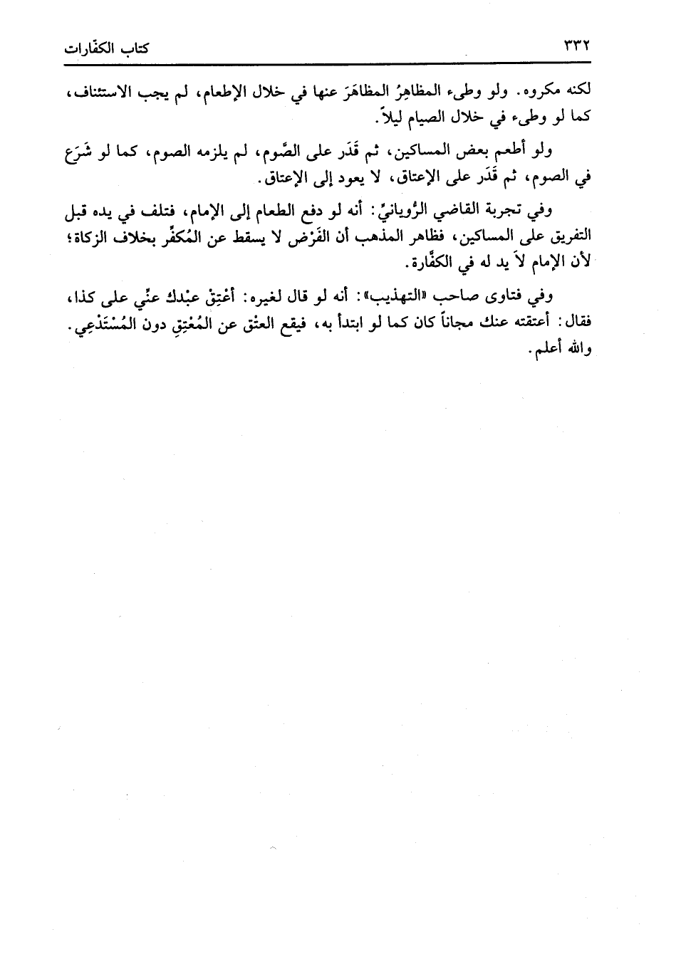 وفي تجربة القاضي الرُّويانيُّ: أنه لو دفع الطعام إلى الإِمام، فتلف في يده قبل التفريق على المساكين، فظاهر المذهب أن الفَرْض لا يسقط عن المُكفِّر بخلاف الزكاة؛ لأن الإِمام لاَ يد له في الكفَّارة.