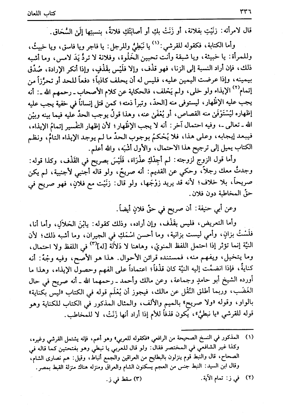 وأما التعريض، فليس بقَذْف، وإن أراده، وذلك كقوله: يابْنَ الحَلاَلِ، وأما أنا، فلَسْتُ بزانٍ، وأمي ليست بزانية، وما أحسن اسْمَكِ في الجيران، وما أشبه ذلك؛ لأن النيَّة إنما تؤثر إذا احتمل اللفظ المنويّ، وهاهنا لا دَلاَلة [له] (¬3) في اللفظ ولا احتمال، وما يتخيل، ويفهم منه، فمستنده قرائن الأحوال. هذا هو الأصح، وفيه وجْهٌ: أنه كنايةٌ، فإذا انضمَّت إليه النيَّة كان قذْفًا؛ اعتمادًا على الفهم وحصول الإيذاء، وهذا ما أورده الشيخ أبو حامدٍ وجماعة، وعن مالك وأحمد -رحمهما الله- أنه صريح في حال الغَضَب، وربما أطلق النَّقْل عن مالك، فيجوز أن يُعْلَم قوله في الكتاب "ليس بكناية" بالواو، وقوله "ولا صريح" بالميم والألف، والمثال المذكور في الكتاب للكناية وهو قوله للقرشي "يا نبطيُّ"، يكون قذفاً للأم إذا أراد أنها زَنَتْ، لا للمخاطب.