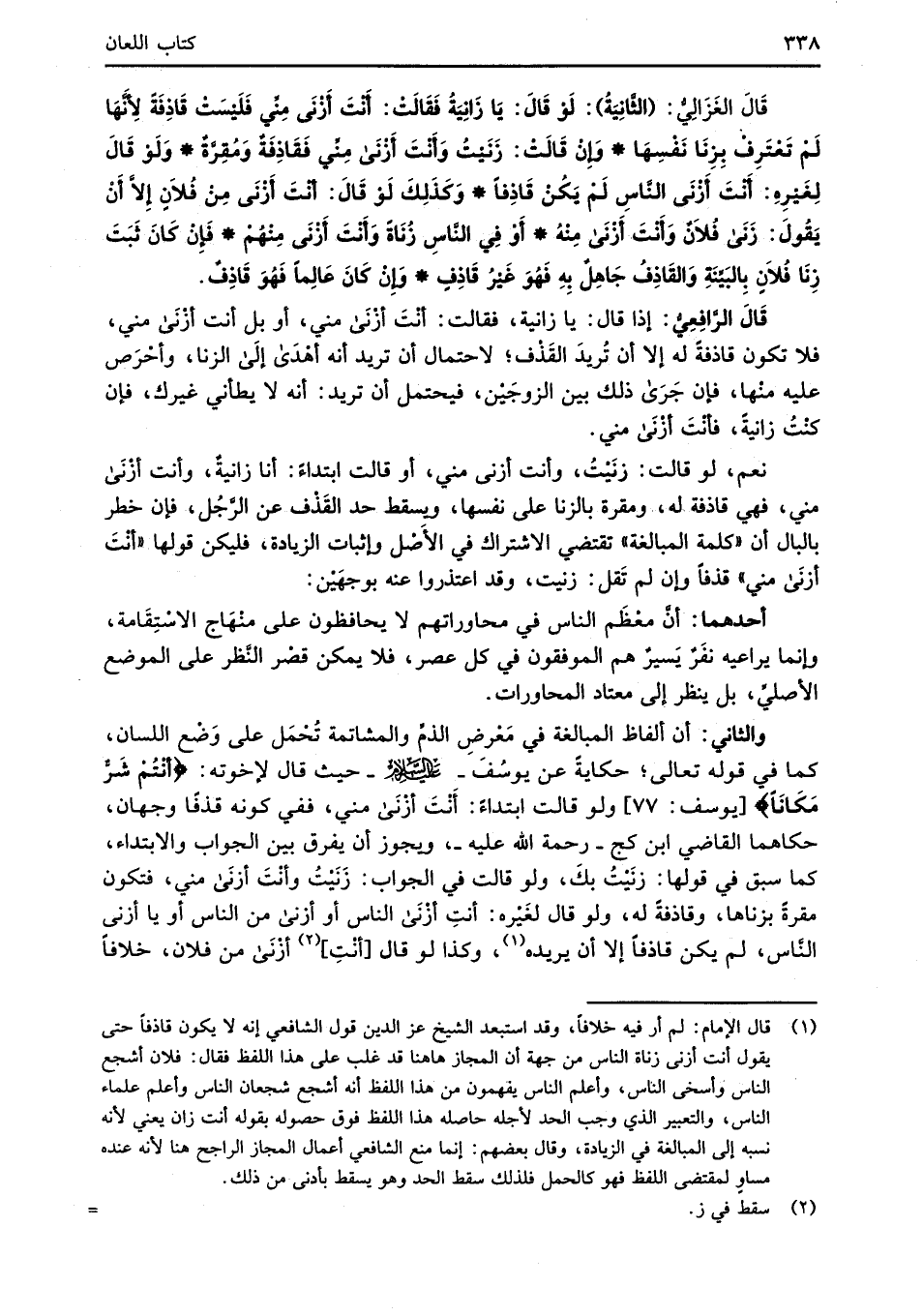 قَالَ الغَزَالِيُّ: (الثَّانِيَةُ): لَوْ قَالَ: يَا زَانِيَةُ فَقَالَتْ: أَنْتَ أَزْنَى مِنِّي فَلَيْسَتْ قَاذِفَةً لأَنَّهَا لَمْ تَعْتَرِف بِزِنَا نَفْسِهَا* وَإِنْ قَالَتْ: زنَيْتُ وَأَنْتَ أَزْنَى مِنِّي فَقَاذفَةٌ وَمُقِرَّةٌ* وَلَوْ قَالَ لِغَيْرِهِ: أَنْتَ أَزْنَى النَّاسِ لَمْ يَكُنْ قَاذِفًا* وَكَذَلِكَ لَوْ قَالَ: أَنْتَ أَزْنَى مِنْ فُلاَنِ إِلاَّ أَنْ يَقُولَ: زَنَى فُلاَنٌ وَأَنْتَ أَزْنَى مِنْهُ* أَوْ فِي النَّاسِ زُنَاةً وَأَنْتَ أَزْنَى مِنْهُمْ* فَإنْ كَانَ ثَبَتَ زِنَا فُلاَنٍ بِالبَيِّنَةِ وَالقَاذِفُ جَاهِلٌ بِهِ فَهُوَ غَيْرُ قَاذِفٍ* وَإِنْ كَانَ عَالِمًا فَهُوَ قَاذِفٌ.