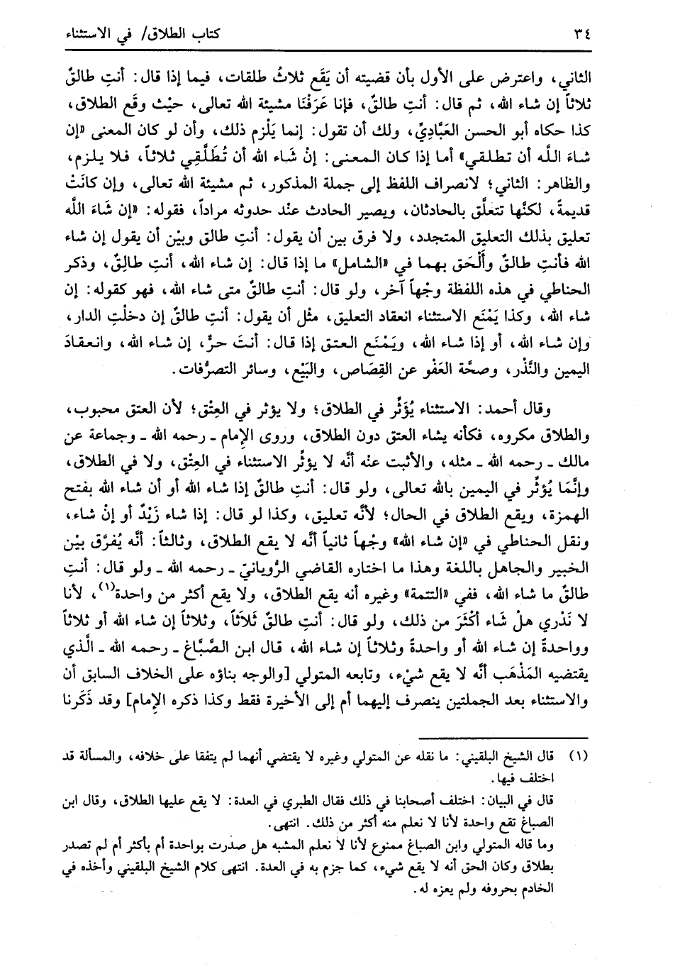 الثاني، واعترض على الأول بأن قضيته أن يَقَع ثلاثُ طلقات، فيما إذا قال: أنتِ طالقٌ ثلاثاً إن شاء الله، ثم قال: أنتِ طالقٌ، فإنا عَرَفْنَا مشيئة الله تعالى، حيْث وقَع الطلاق، كذا حكاه أبو الحسن العَبَّادِيِّ، ولك أن تقول: إنما يَلْزم ذلك، وأن لو كان المعنى "إن شاءَ الله أن تطلقي" أما إذا كان المعنى: إنْ شَاء الله أن تُطَلَّقِي ثلاثاً، فلا يلزم، والظاهر: الثاني؛ لانصراف اللفظ إلى جملة المذكور، ثم مشيئة الله تعالى، وإن كانَتْ قديمة، لكنَّها تتعلَّق بالحادثان، ويصير الحادث عنْد حدوثه مراداً، فقدله: "إن شَاءَ الله تعليق بذلك التعليق المتجدد، ولا فرق بين أن يقول: أنتِ طالق وبيْن أن يقول إن شاء الله فأنتِ طالقٌ وأَلْحَق بهما في "الشامل" ما إذا قال: إن شاء الله، أنتِ طالِقٌ، وذكر الحناطي في هذه اللفظة وجْهاً آخر، ولو قال: أنتِ طالقٌ متى شاء الله، فهو كقوله: إن شاء الله، وكذا يَمْنَع الاستثناء انعقاد التعليق، مثْل أن يقول: أنتِ طالقٌ إن دخلْتِ الدار، وان شاء الله، أو إذا شاء الله، وَيمْنَع العتق إذا قال: أنتَ حرٌّ، إن شاء الله، وانعقادَ اليمين والنَّذْر، وصحة العَفْو عن القِصَاص، والبَيْع، وسائر التصرُّفات.