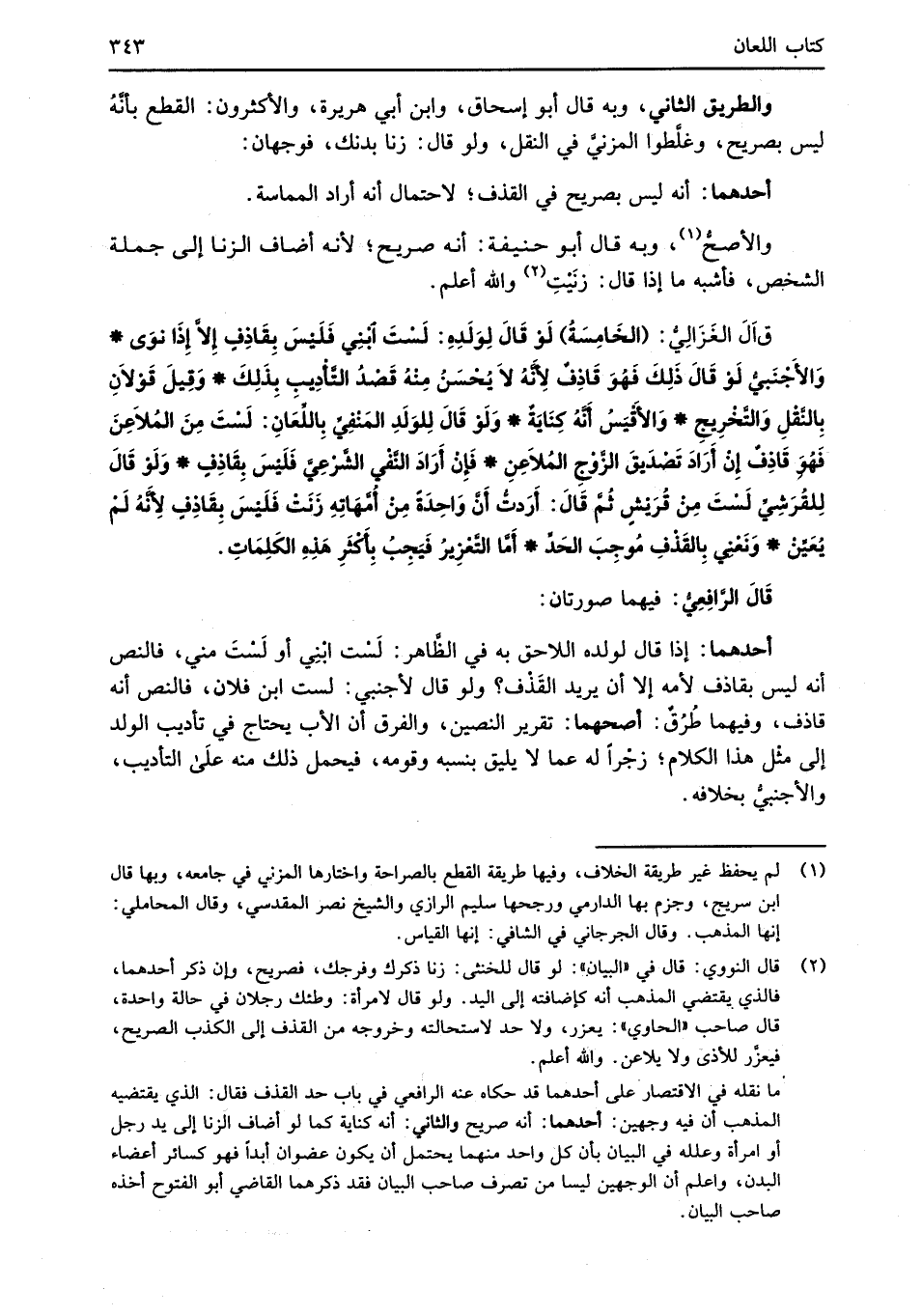 قاَلَ الغَزَالِيُّ: (الخَامِسَةُ) لَوْ قَالَ لِوَلَدِهِ: لَسْتَ ابْنِي فَلَيْسَ بِقَاذِفٍ إِلاَّ إِذَا نوَى* وَالأَجْنَبيُّ لَوْ قَالَ ذَلِكَ فَهُوَ قَاذِفٌ لأَنَّهُ لاَ يُحْسَنُ مِنْهُ قَصْدُ التَّأْدِيبِ بِذَلِكَ* وَقِيلَ قَوْلاَنِ بِالنَّقْلِ وَالتَّخْرِيجِ* وَالأَقْيَسُ أَنَّهُ كِنَايَةٌ* وَلَوْ قَالَ لِلوَلَدِ المَنْفِيِّ بِاللِّعَانِ: لَسْتَ مِنَ المُلاَعِنَ فَهُوَ قَاذِفٌ إنْ أَرَادَ تَصْدَيقَ الزَّوْجِ المُلاَعِنِ* فَإِنْ أَرَادَ النَّفْي الشَّرْعِيَّ فَلَيْسَ بِقَاذِفٍ* وَلَوْ قَالَ لِلقُرَشِيِّ لَسْتَ مِنْ قُرَيْشٍ ثُمَّ قَالَ: أَرَدتُّ أَنَّ وَاحِدَةً مِنْ أُمّهَاتِهِ زنَتْ فَلَيْسَ بِقَاذِفٍ لأَنَّهُ لَمْ يُعَيِّنْ* وَنَعْني بِالقَذْفِ مُوجِبَ الحَدِّ* أَمَّا التَّعْزِيرُ فَيَجِبُ بِأَكْثَرِ هَذهِ الكَلِمَاتِ.