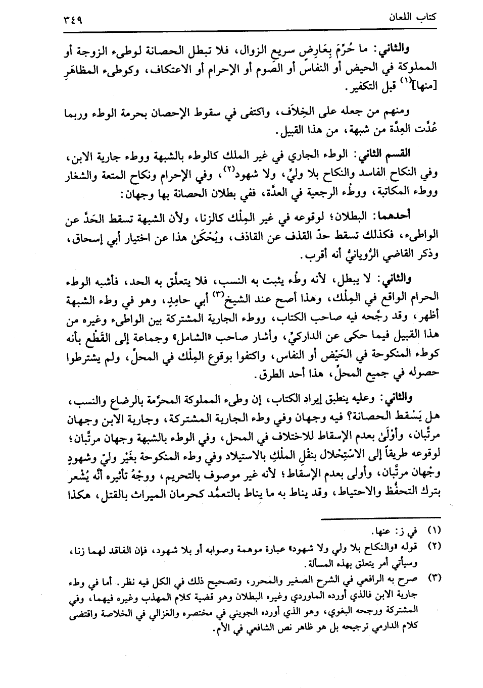 والثاني: وعليه ينطبق إيراد الكتاب، إن وطئ المملوكة المحرَّمة بالرضاع والنسب، هل يَسْقط الحصانة؟ فيه وجهان وفي وطء الجارية المشتركة، وجارية الابن وجهان مرتَّبان، وأوْلَي بعدم الإسقاط للاختلاف في المحل، وفي الوطء بالشبهة وجهان مرتَّبان؛ لوقوعه طريقًا إلى الاسْتِحْلال بنقْلِ الملْكِ بالاستيلاد وفي وطء المنكوحة بغَيْر وليّ وشهودٍ وجْهان مرتَّبان، وأولى بعدم الإسقاط؛ لأنه غير موصوف بالتحريم، ووجْهُ تأثيره أنَّه يُشْعر بترك التحفُّظ والاحتياط، وقد يناط به ما يناط بالتعمُّد كحرمان الميراث بالقتل، هكذا