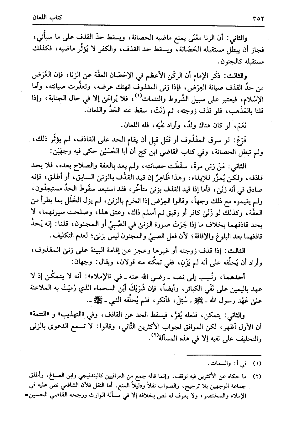 والثالث: ذكَر الإِمام أن الركْن الأعظم في الإحْصَان العفَّة عن الزنا، فإن الغَرَض من حدِّ القذف صيانة العِرْض، فإذا زنى المقذوف انهتك عرضه، وتعذَّرت صيانته، وأما الإِسْلام، فيعتبر على سبيل الشُّروط والتتمات (¬1)، فلا يُراعَى إلا في حال الجنابة، وإذا قلنا بالمَذْهب، فلو قذف زوجته، ثم زَنَتْ، سقط عنه الحَدُّ واللعان.