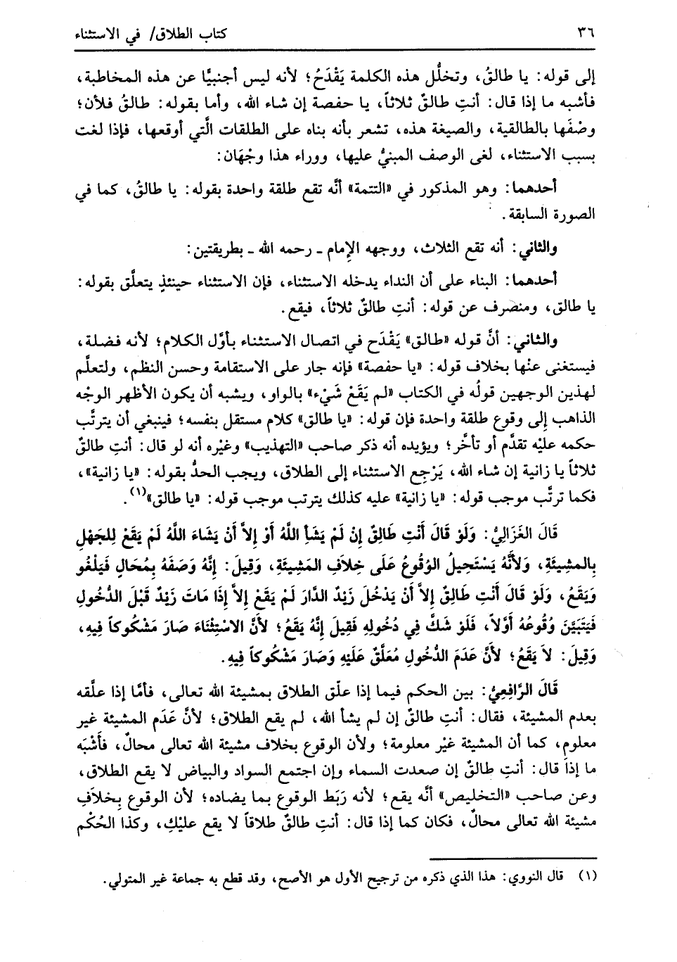 قَالَ الغَزَالِيُّ: وَلَوْ قَالَ أَنْتِ طَالِقٌ إنْ لَمْ يَشَأ اللهُ أَوْ إِلاَّ أنْ يَشَاءَ اللهُ لَمْ يَقَعْ لِلجَهْلِ بِالمشِيئَةِ، وَلأَنَّهُ يَسْتَحِيلُ الوُقُوعُ عَلَى خِلاَفِ المَشِيئَةِ، وَقِيلَ: إِنَّهُ وَصَفَهُ بِمُحَالٍ فَيَلْغُو وَيَقَعُ، وَلَوْ قَالَ أَنْتِ طَالِقٌ إِلاَّ أنْ يَدْخُلَ زَيْدٌ الدَّارَ لَمْ يَقَعْ إِلاَّ إِذَا مَاتَ زَيْدٌ قَبْلَ الدُّخُولِ فَيَتَبَيَّنَ وُقُوعُهُ أَوَّلاً، فَلَوْ شَكَّ في دُخُولِهِ فَقِيلَ إِنَّهُ يَقَعُ؛ لأَنَّ الاسْتِثْنَاءَ صَارَ مَشْكُوكاً فِيهِ، وَقِيلَ: لاَ يَقَعُ؛ لأَنَّ عَدَمَ الدُّخُولِ مُعَلَّقٌ عَلَيْهِ وَصَارَ مَشْكُوكاً فِيهِ.