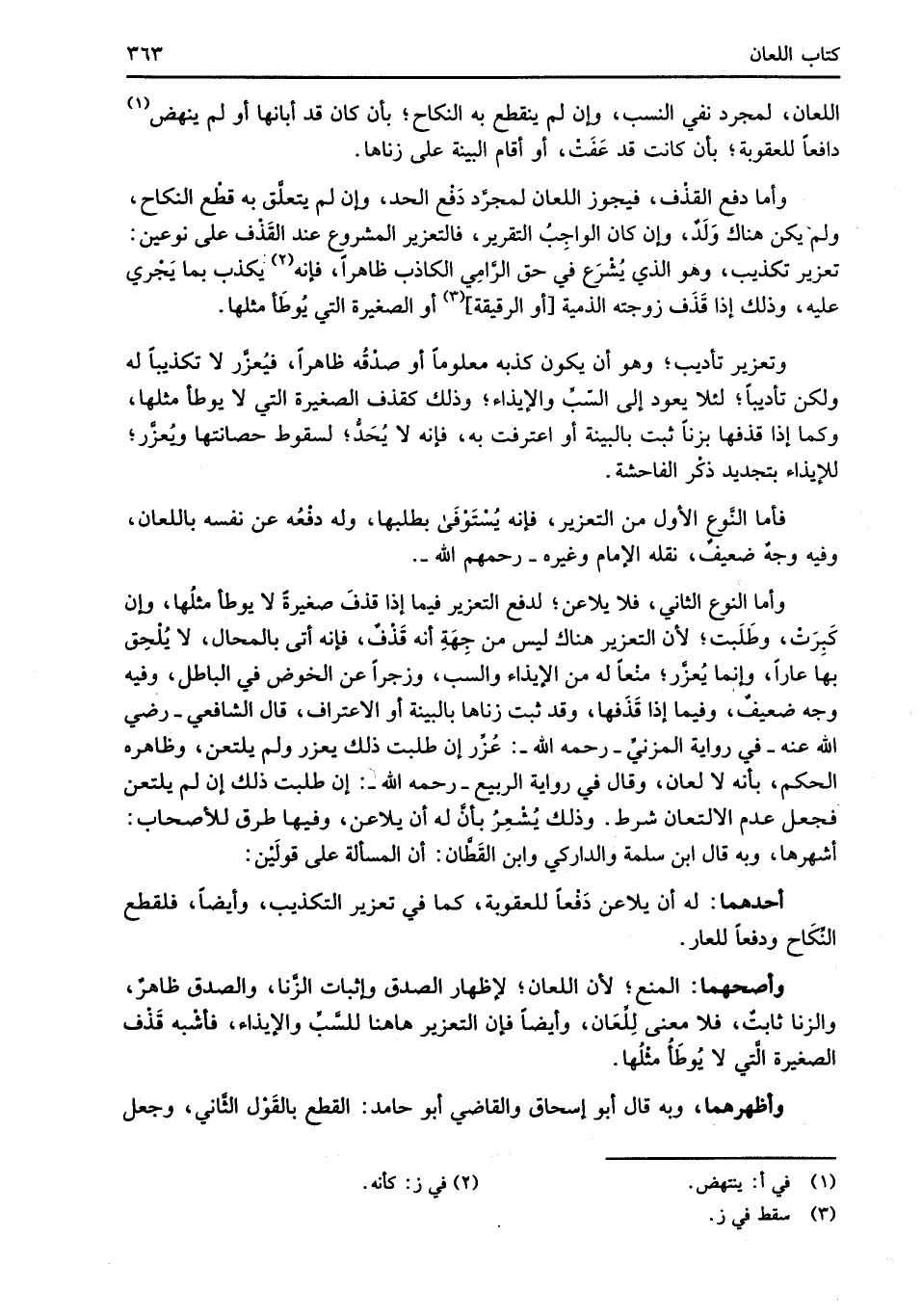 وأما دفع القذْف، فيجوز اللعان لمجرَّد دَفْع الحد، وإن لم يتعلَّق به قطْع النكاح، ولم يكن هناك وَلَدٌ، وإن كان الواجِبُ التقرير، فالتعزير المشروع عند القَذْف على نوعين: تعزير تكذيب، وهو الذي يُشْرَع في حق الرَّامِي الكاذب ظاهرًا، فإنه (¬2) يكذب بما يَجْري عليه، وذلك إذا قَذَف زوجته الذمية [أو الرقيقة] (¬3) أو الصغيرة التي يُوطَأ مثلها.