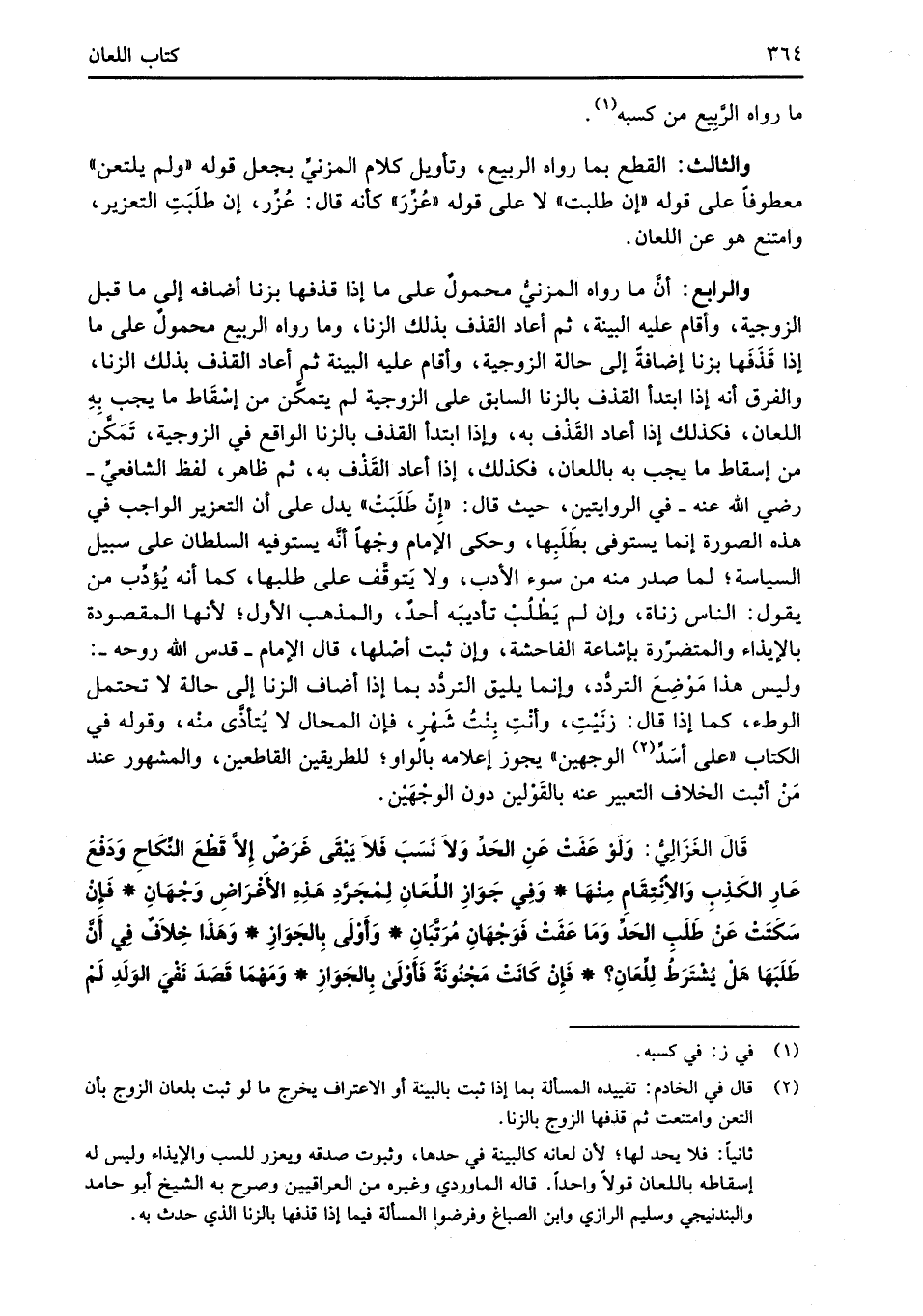 والرابع: أنَّ ما رواه المزنيُّ محمولٌ على ما إذا قذفها بزنا أضافه إلى ما قبل الزوجية، وأقام عليه البينة، ثم أعاد القذف بذلك الزنا، وما رواه الربيع محمولٌ على ما إذا قَذَفَها بزنا إضافةً إلى حالة الزوجية، وأقام عليه البينة ثم أعاد القذف بذلك الزنا، والفرق أنه إذا ابتدأ القذف بالزنا السابق على الزوجية لم يتمكَّن من إسْقَاط ما يجب بِهِ اللعان، فكذلك إذا أعاد القَذْف به، وإذا ابتدأ القذف بالزنا الواقع في الزوجية، تَمَكَّنَ من إسقاط ما يجب به باللعان، فكذلك، إذا أعاد القَذْف به، ثم ظاهر، لفظ الشافعيِّ -رضي الله عنه- في الروايتين، حيث قال: "إِنّ طَلَبَتْ" يدل على أن التعزير الواجب في هذه الصورة إنما يستوفى بطَلَبِها، وحكى الإِمام وجْهًا أنَّه يستوفيه السلطان على سبيل السياسة؛ لما صدر منه من سوء الأدب، ولا يَتوقَّف على طلبها، كما أنه يُؤدِّب من يقول: الناس زناة، وإن لم يَطْلُبْ تأديبَه أحدٌ، والمذهب الأول؛ لأنها المقصودة بالإيذاء والمتضرِّرة بإشاعة الفاحشة، وإن ثبت أصْلها، قال الإِمام -قدس الله روحه-: وليس هذا مَوْضِعَ التردُّد، وإنما يليق التردُّد بما إذا أضاف الزنا إلى حالة لا تحتمل الوطء، كما إذا قال: زنَيْتِ، وأنْتِ بِنْتُ شَهْرٍ، فإن المحال لا يُتاذَّى منْه، وقوله في الكتاب "على أسَدِّ (¬2) الوجهين" يجوز إعلامه بالواو؛ للطريقين القاطعين، والمشهور عند مَنْ أثبت الخلاف التعبير عنه بالقَوْلين دون الوجْهَيْن.