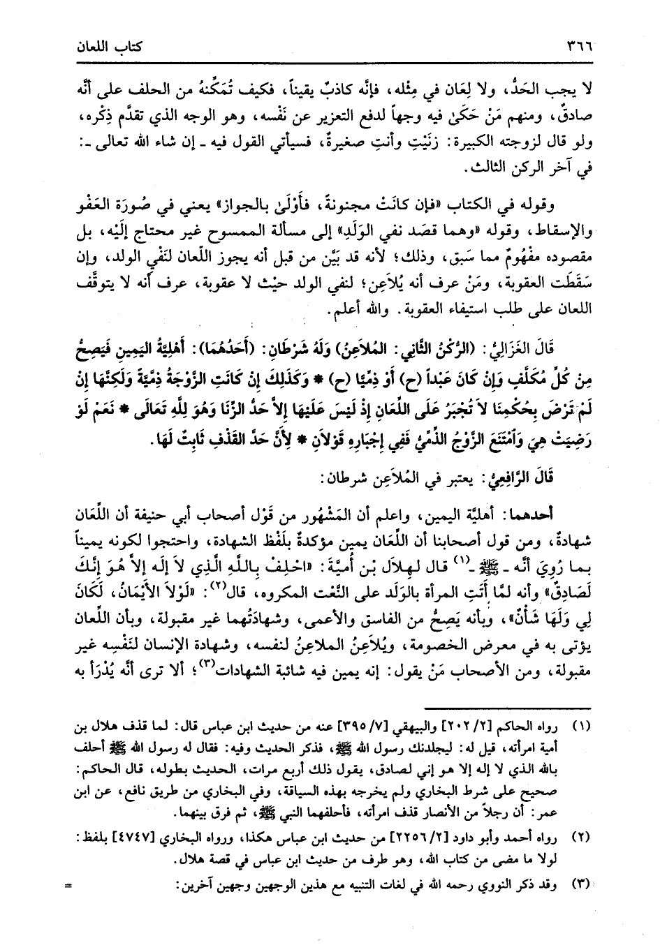 قَالَ الغَزَالِيُّ: (الرُّكْنُ الثَّانِي: المُلاَعِنُ) وَلَهُ شَرْطَانِ: (أَحَدُهُمَا): أَهْلِيَّةُ اليَمِينِ فَيَصِحُّ مِنْ كُلِّ مُكَلَّفٍ وَإِنْ كَانَ عَبْدًا (ح) أَوْ ذِمِّيَّاً (ح) * وَكَذَلِكَ إِنْ كَانَتِ الزَّوْجَةُ ذِمِّيَّةً وَلَكِنَّهَا إنْ لَمْ تَرْضَ بِحُكْمِنَا لاَ تُجْبَرُ عَلَى اللِّعَانِ إِذْ لَيْس عَلَيْهَا إِلاَّ حَدُّ الزِّنَا وَهُوَ لله تَعَالَى* نَعَمْ لَوْ رَضِيَتْ هِيَ وَامْتنَعَ الزَّوْجُ الذِّمِّيُّ فَفِي إِجْبَارِهِ قَوْلاَنِ* لأَنَّ حَدَّ القَذْفِ ثَابِتٌ لَهَا.