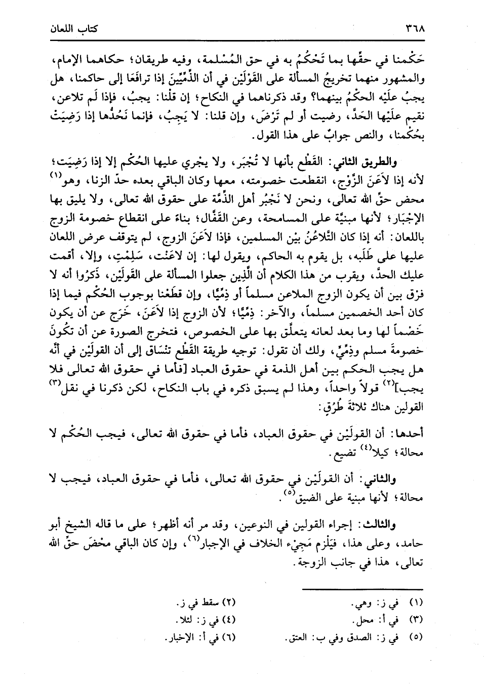 والطريق الثاني: القَطْع بأنها لا تُجْبَر، ولا يجْري عليها الحُكْم إلا إذا رَضِيَت؛ لأنه إذا لاَعَنَ الزَّوْج، انقطعت خصومته، معها وكان الباقي بعده حدّ الزنا، وهو (¬1) محض حقِّ الله تعالى، ونحن لا نَجْبُر أهل الذِّمَّة على حقوق الله تعالى، ولا يليق بها الإجْبَار؛ لأنها مبنيَّة على المسامحة، وعن القَفَّال؛ بناءً على انقطاع خصومة الزوج باللعان: أنه إذا كان التَّلاعُنُ بيْن المسلمين، فإذا لاَعَنَ الزوج، لم يتوقف عرض اللعان عليها على طَلَبه، بل يقوم به الحاكم، ويقول لها: إن لاعَنْت، سَلِمْتِ، وإلا، أقمت عليك الحدَّ، ويقرب من هذا الكلام أن الَّذِين جعلوا المسألة على القَولَيْن، ذَكرُوا أنه لا فرْق بين أن يكون الزوج الملاعن مسلمًا أو ذِمِّيَّاً، وإن قطَعْنا بوجوب الحُكْم فيما إذا كان أحد الخصمين مسلمًا، والآخر: ذِمِّيَّاً؛ لأن الزوج إذا لاَعَنَ، خَرَج عن أن يكون خَصْمًا لها وما بعد لعانه يتعلَّق بها على الخصوص، فتخرج الصورة عن أن تكُونَ خصومةَ مسلم وذِمِّيِّ، ولك أن تقول: توجيه طريقة القَطْع تنْسَاق إلى أن القولَيْن في أنَّه هل يجب الحكم بين أهل الذمة في حقوق العباد [فأما في حقوق الله تعالى فلا يجب] (¬2) قولاً واحدًا، وهذا لم يسبق ذكره في باب النكاح، لكن ذكرنا في نقل (¬3) القولين هناك ثلاثةَ طُرُقٍ: