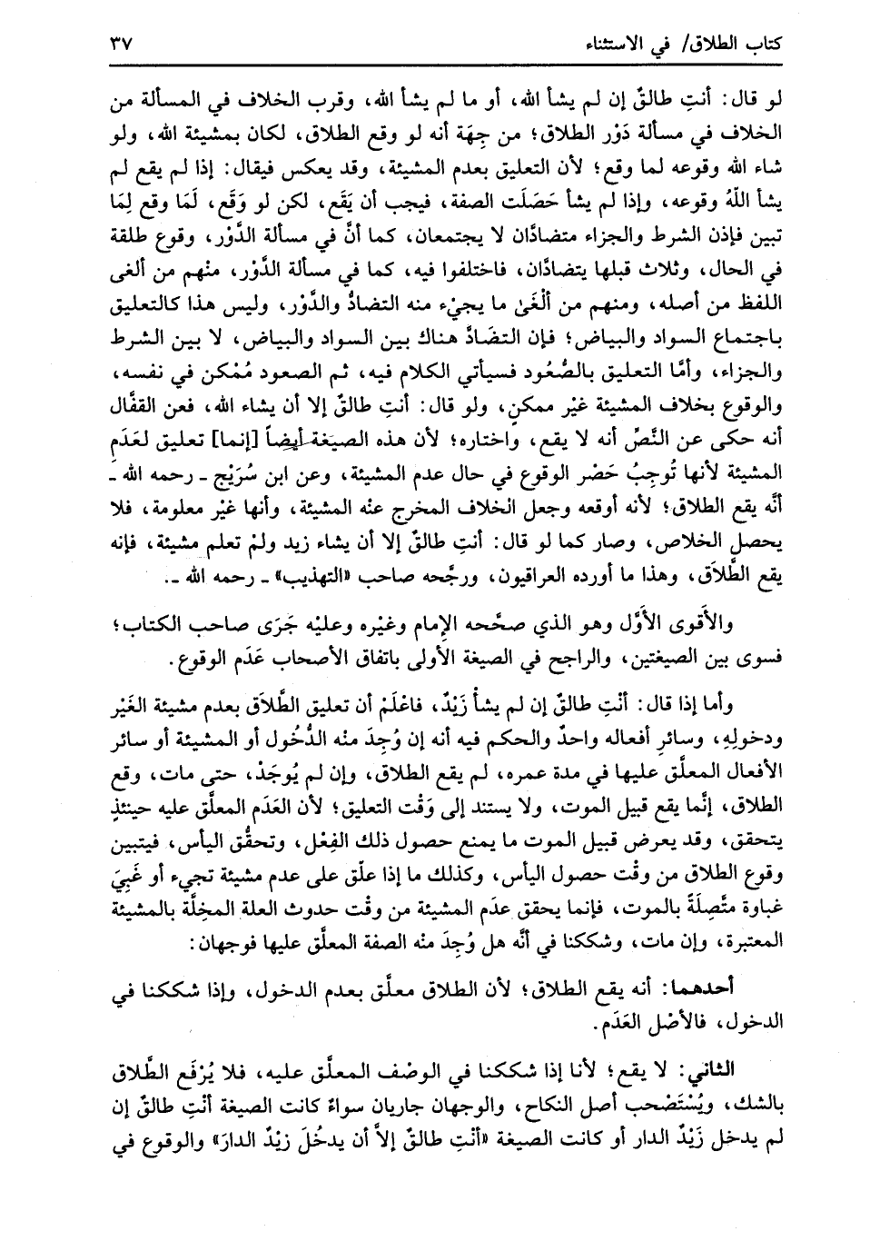 لو قال: أنتِ طالقٌ إن لم يشأ الله، أو ما لم يشأ الله، وقرب الخلاف في المسألة من الخلاف في مسألة دَوْر الطلاق؛ من جِهَة أنه لو وقع الطلاق، لكان بمشيئة الله، ولو شاء الله وقوعه لما وقع؛ لأن التعليق بعدم المشيئة، وقد يعكس فيقال: إذا لم يقع لم يشأ اللهُ وقوعه، وإذا لم يشأ حَصَلَت الصفة، فيجب أن يَقَع، لكن لو وَقَع، لَمَا وقع لِمَا تبين فإذن الشرط والجزاء متضادَّان لا يجتمعان، كما أنَّ في مسألة الدَّوْر، وقوع طلقة في الحال، وثلاث قبلها يتضادَّان، فاختلفوا فيه، كما في مسألة الدَّوْر، منْهم من ألغى اللفظ من أصله، ومنهم من ألْغَى ما يجيْء منه التضادُّ والدَّوْر، وليس هذا كالتعليق باجتماع السواد والبياض؛ فإن التضَادَّ هناك بين السواد والبياض، لا بين الشرط والجزاء، وأمَّا التعليق بالصُّعُود فسيأتي الكلام فيه، ثم الصعود مُمْكن في نفسه، والوقوع بخلاف المشيئة غيْر ممكنٍ، ولو قال: أنتِ طالقٌ إلا أن يشاء الله، فعن القفَّال أنَّه حكى عن النَّصِّ أنه لا يقع، واختاره؛ لأن هذه الصيغة أيضاً [إنما] تعليق لعَدَمِ المشيئة لأنها تُوجِبُ حَصْر الوقوع في حال عدم المشيئة، وعن ابن سُرَيْج -رحمه الله- أنَّه يقع الطلاق؛ لأنه أوقعه وجعل الخلاف المخرج عنْه المشيئة، وأنها غيْر معلومة، فلا يحصل الخلاص، وصار كما لو قال: أنتِ طالقٌ إلا أن يشاء زيد ولمْ تعلم مشيئة، فإنه يقع الطَّلاَق، وهذا ما أورده العراقيون، ورجَّحه صاحب "التهذيب" -رحمه الله-.