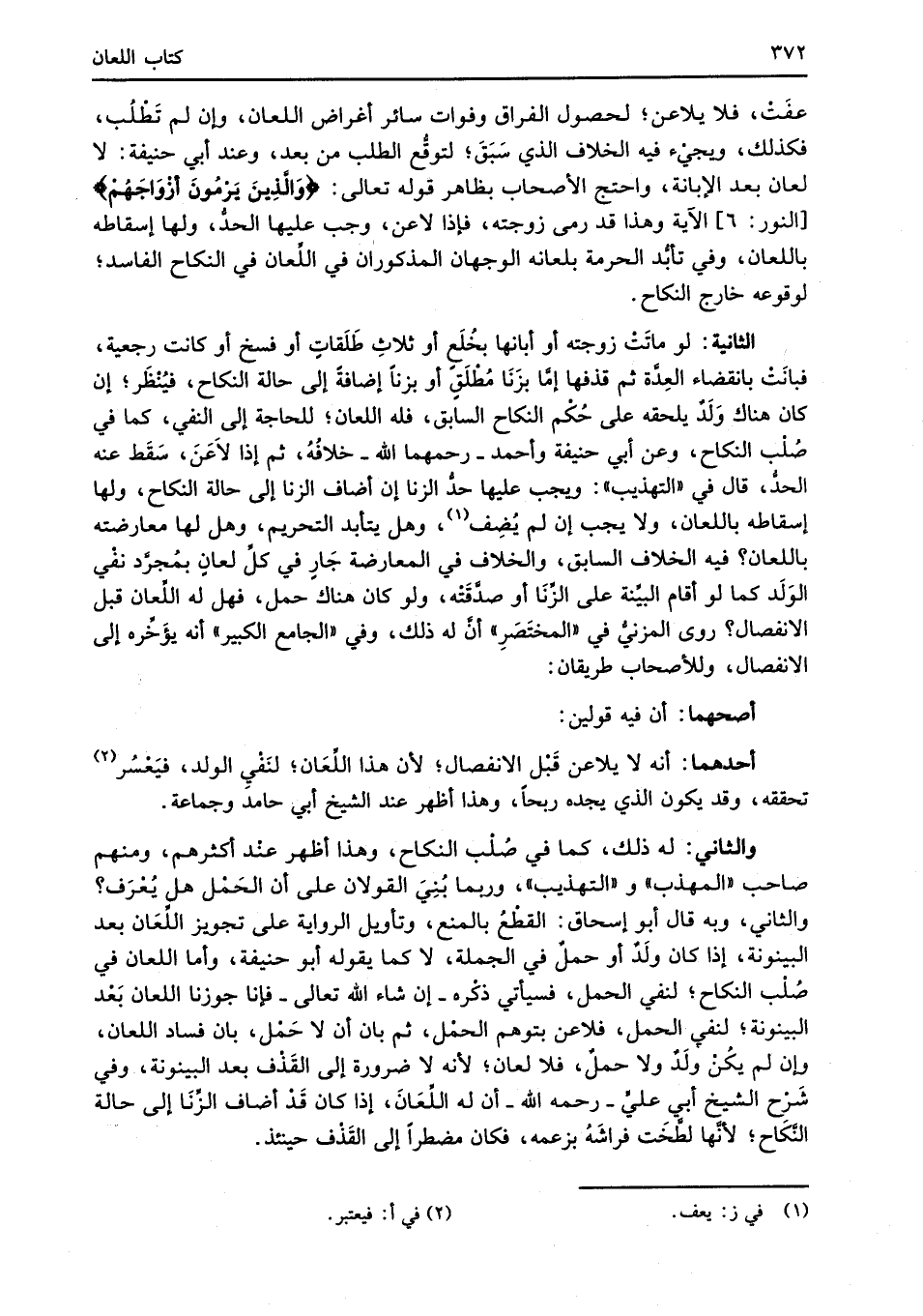 الثانية: لو ماتَتْ زوجته أو أبانها بخُلَع أو ثلاثِ طَلَقاتٍ أو فسخ أو كانت رجعية، فبانَتْ بانقضاء العِدَّة ثم قذفها إمَّا بزَنَا مُطْلَقٍ أو بزناً إضافةً إلى حالة النكاح، فيُنْظَر؛ إن كان هناك وَلَدٌ يلحقه على حُكْم النكاح السابق، فله اللعان؛ للحاجة إلى النفي، كما في صُلْب النكاح، وعن أبي حنيفة وأحمد -رحمهما الله- خلافُهُ، ثم إذا لاَعَنَ، سَقَط عنه الحدُّ، قال في "التهذيب" ويجب عليها حدُّ الزنا إن أضاف الزنا إلى حالة النكاح، ولها إسقاطه باللعان؛ ولا يجب إن لم يُضِف (¬1)، وهل يتأبد التحريم، وهل لها معارضته باللعان؟ فيه الخلاف السابق، والخلاف في المعارضة جَارٍ في كل لعانٍ بمُجرَّد نفْي الوَلَد كما لو أقام البيِّنة على الزِّنَا أو صدَّقَتْه، ولو كان هناك حمل، فهل له اللِّعان قبل الانفصال؟ روى المزنيُّ في "المختَصَرِ" أنَّ له ذلك، وفي "الجامع الكبير" أنه يؤَخِّره إلى الانفصال، وللأصحاب طريقان: