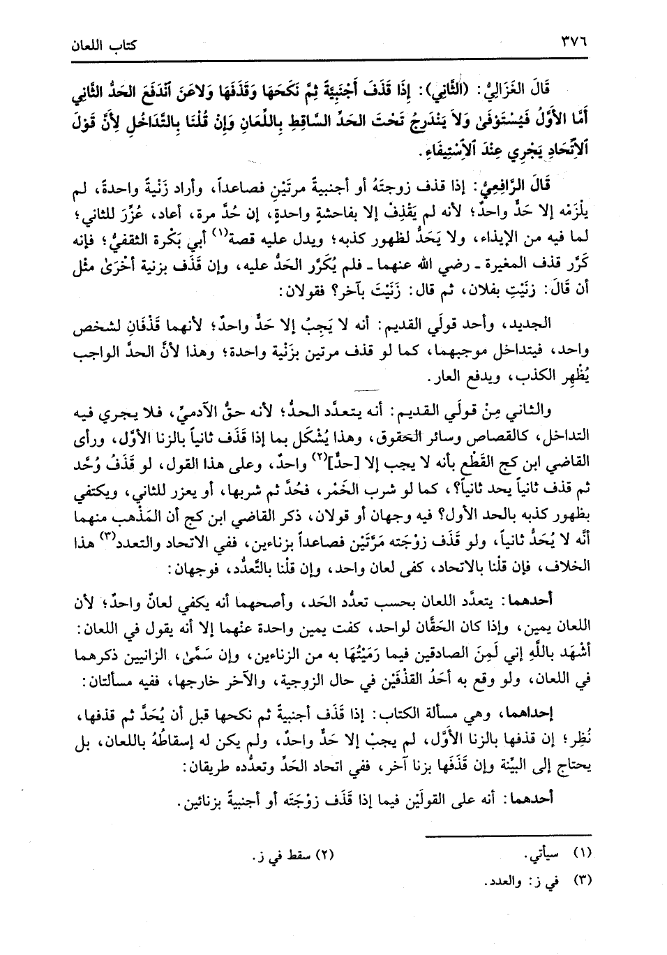 قَالَ الغَزَالِيُّ: (الثَّانِي): إِذَا قَذَفَ أَجْنَبِيَّةَ ثِمَّ نَكَحَهَا وَقَذَفَهَا وَلاعَنَ انْدَفَعَ الحَدُّ الثَّانِي أَمَّا الأَوَّلُ فَيُسْتَوْفَى وَلاَ يَنْدَرجُ تَحْتَ الحَدِّ السَّاقِطِ بِاللِّعَانِ وَإِنْ قُلْنَا بِالتَّدَاخُلِ لأَنَّ قَوْلَ الإتِّحَادِ يَجْرِي عِنْدَ الاسْتِيفَاءِ.