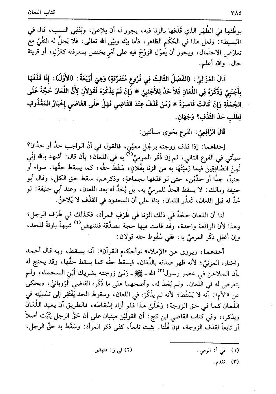 قَالَ الغَزَالِيُّ: (الفَصْلُ الثَّالِثُ في فُرُوعٍ مُتَفَرِّقَةٍ) وَهِيَ أَرْبَعَةٌ: (الأَوَّلُ): إِذَا قَذَفَهَا بِأجْنَبِيِّ وَذَكَرَهُ في اللِّعَانِ فَلاَ حَدَّ لِلأَجْنَبِيِّ* وَإِنْ لَمْ يَذْكُرهُ فَقَوْلاَنِ لأَنَّ اللِّعَانَ حُجَّةٌ عَلَى الجُمْلَةِ وَإِنْ كَانَتْ قَاصِرَةً* وَمَنْ قَذَفَ عِنْدَ القَاضِي فَهَلْ عَلَى القَاضي إِخْبَارُ المَقْذُوفِ لِطَلَبِ حَدِّ القَذْفِ؟ وَجْهَانِ.