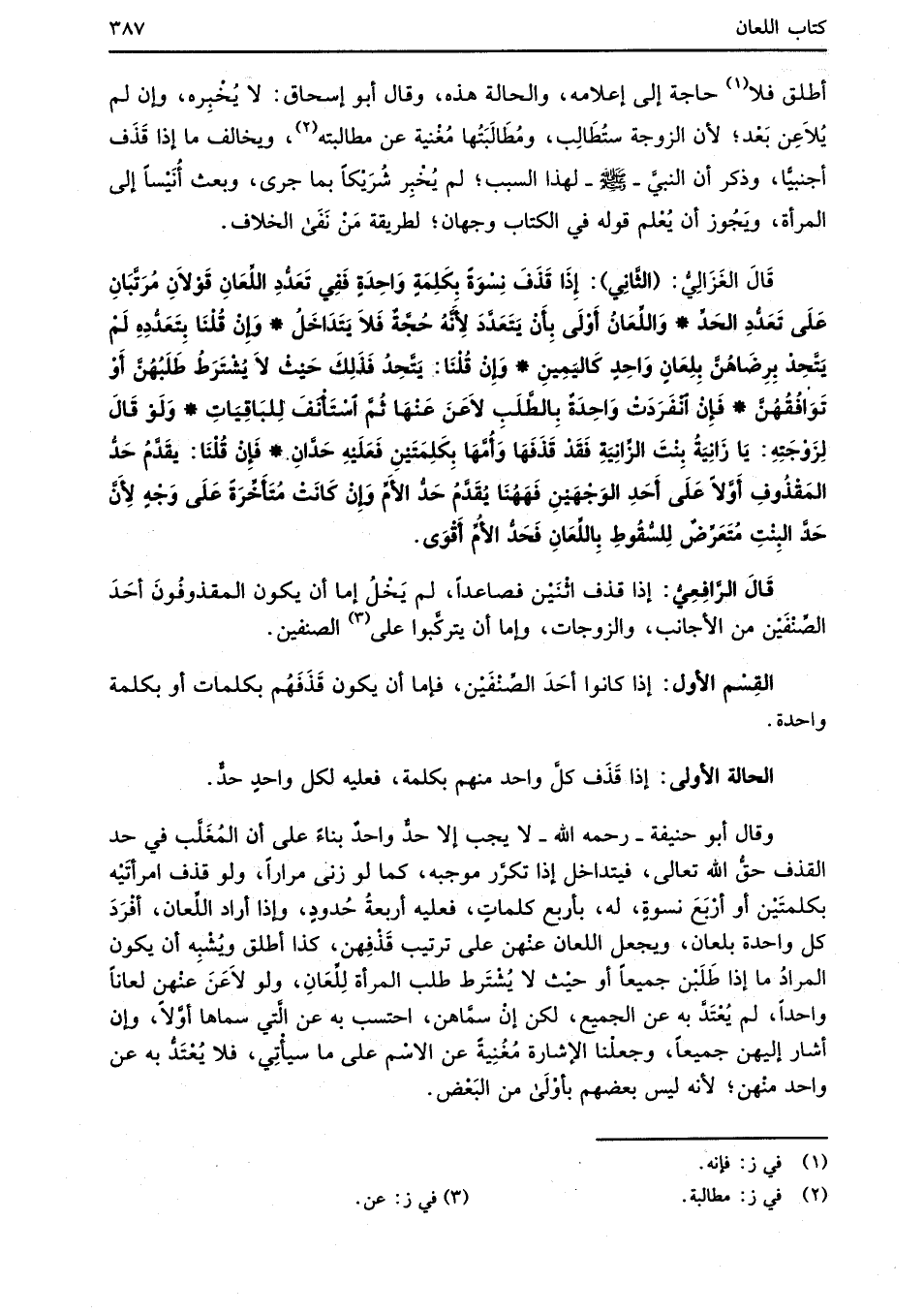 قَالَ الغَزَالِيُّ: (الثَّانِي): إِذَا قَذَفَ نِسْوَةً بكَلِمَةٍ وَاحِدَةٍ فَفِي تَعَدُّدِ اللِّعَانِ قَوْلاَنِ مُرَتَّبَانِ عَلَى تَعَدُّدِ الحَدِّ* وَاللِّعَانُ أَوْلَى بِأَنْ يَتَعَدَّدَ لأَنَّهُ حُجَّةٌ فَلاَ يَتَدَاخَلُ* وَإِنْ قُلْنَا بِتَعَدُّدِهِ لَمْ يَتَّحِدْ بِرِضَاهُنَّ بِلِعَانٍ وَاحِدٍ كَاليَمِينِ* وَإِنْ قُلْنَا: يَتَّحِدُ فَذَلِكَ حَيْثْ لاَ يُشْتَرَطُ طَلَبُهُنَّ أَوْ تَوَافُقُهُنَّ* فَإِنْ انْفَرَدَتْ وَاحِدَةٌ بِالطَّلَبِ لاَعَنَ عَنْهَا ثُمَّ اسْتَأنَفَ لِلبَاقِيَاتِ* وَلَوْ قَالَ لِزَوْجَتِهِ: يَا زَانِيَةُ بِنْتَ الزَّانِيَةِ فَقَدْ قَذَفَهَا وَأُمَّهَا بِكلِمَتَيْنِ فَعَلَيْهِ حَدَّانِ* فَإِنْ قُلْنَا: يقَدَّمُ حَدُّ المَقْذُوفِ أَوَّلاً عَلَى أَحَدِ الوَجْهَيْنِ فَهَهُنَا يُقَدَّمُ حَدُّ الأَمِّ وَإِنْ كَانَتْ مُتَأَخِّرَةً عَلَى وَجْهٍ لأَنَّ حَدَّ البِنْتِ مُتَعَرِّضٌ لِلسُّقُوطِ بِاللِّعَانِ فَحَدُّ الأمِّ أَقْوَى.