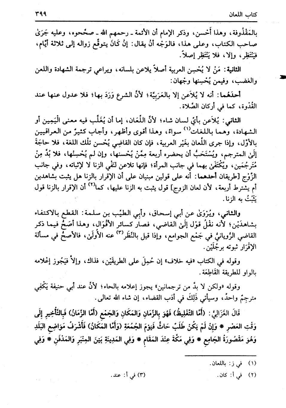 الثانية: مَنْ لا يُحْسِن العربية أصلاً يلاعن بلسانه، ويراعي ترجمة الشهادة واللعن والغضب، وفيمن يُحْسِنها وجْهان:
