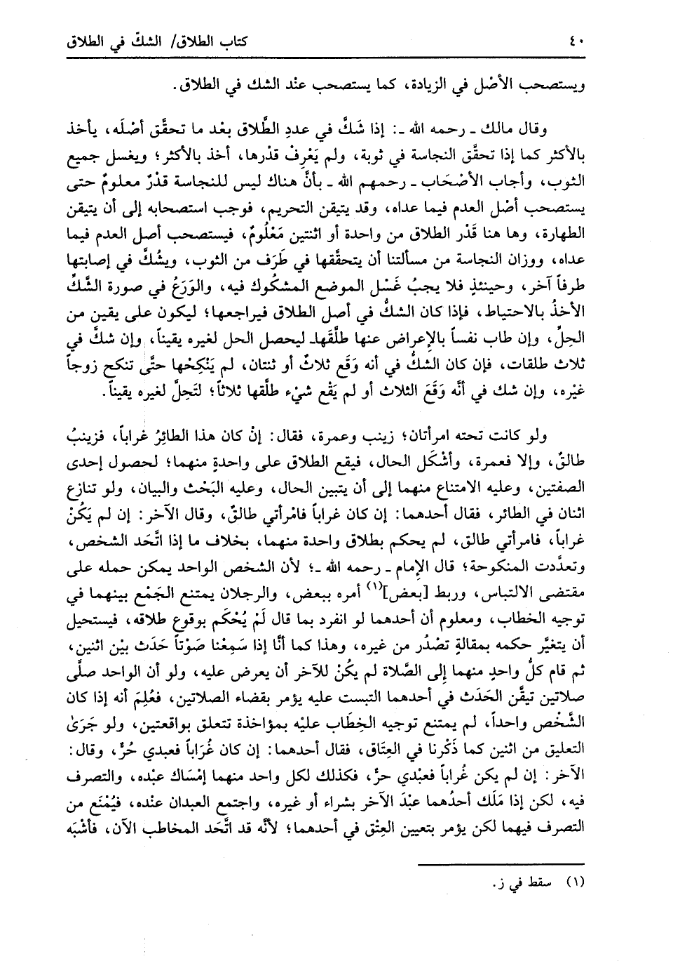 وقال مالك -رحمه الله-: إذا شَكَّ في عددِ الطَّلاق بعْد ما تحقَّق أصْلَه، يأخذ بالأكثر كما إذا تحقَّق النجاسة في ثوبة، ولم يَعْرِفْ قدْرها، أخذ بالأكثر؛ ويغسل جميع الثوب، وأجاب الأصْحَاب -رحمهم الله- بأنَّ هناك ليس للنجاسة قدْرٌ معلومٌ حتى يستصحب أصْل العدم فيما عداه، وقد يتيقن التحريم، فوجب استصحابه إلى أن يتيقن الطهارة، وهاهنا قَدْر الطلاق من واحدة أو اثنتين مَعْلُومٌ، فيستصحب أصل العدم فيما عداه، ووزان النجاسة من مسألتنا أن يتحقَّقها في طَرَف من الثوب، ويشُكَّ في إصابتها طرفاً آخر، وحينئذٍ فلا يجبُ غَسْل الموضع المشكُوك فيه، والوَرَعُ في صورة الشَّكِّ الأخذُ بالاحتياط، فإذا كان الشكُّ في أصل الطلاق فيراجعها؛ ليكون على يقين من الحِلِّ، وإن طاب نفساً بالإِعراض عنها طلَّقَها ليحصل الحل لغيره يقيناً، وإن شكَّ في ثلاث طلقات، فإن كان الشكُّ في أنه وَقَع ثلاثٌ أو ثنتان، لم يَنْكِحْها حتَّى تنكح زوجاً غيْره، وإن شك في أنَّه وَقَعَ الثلاث أو لم يَقْع شيء طلقها ثلاثاً؛ لتَحِلَّ لغيره يقيناً.